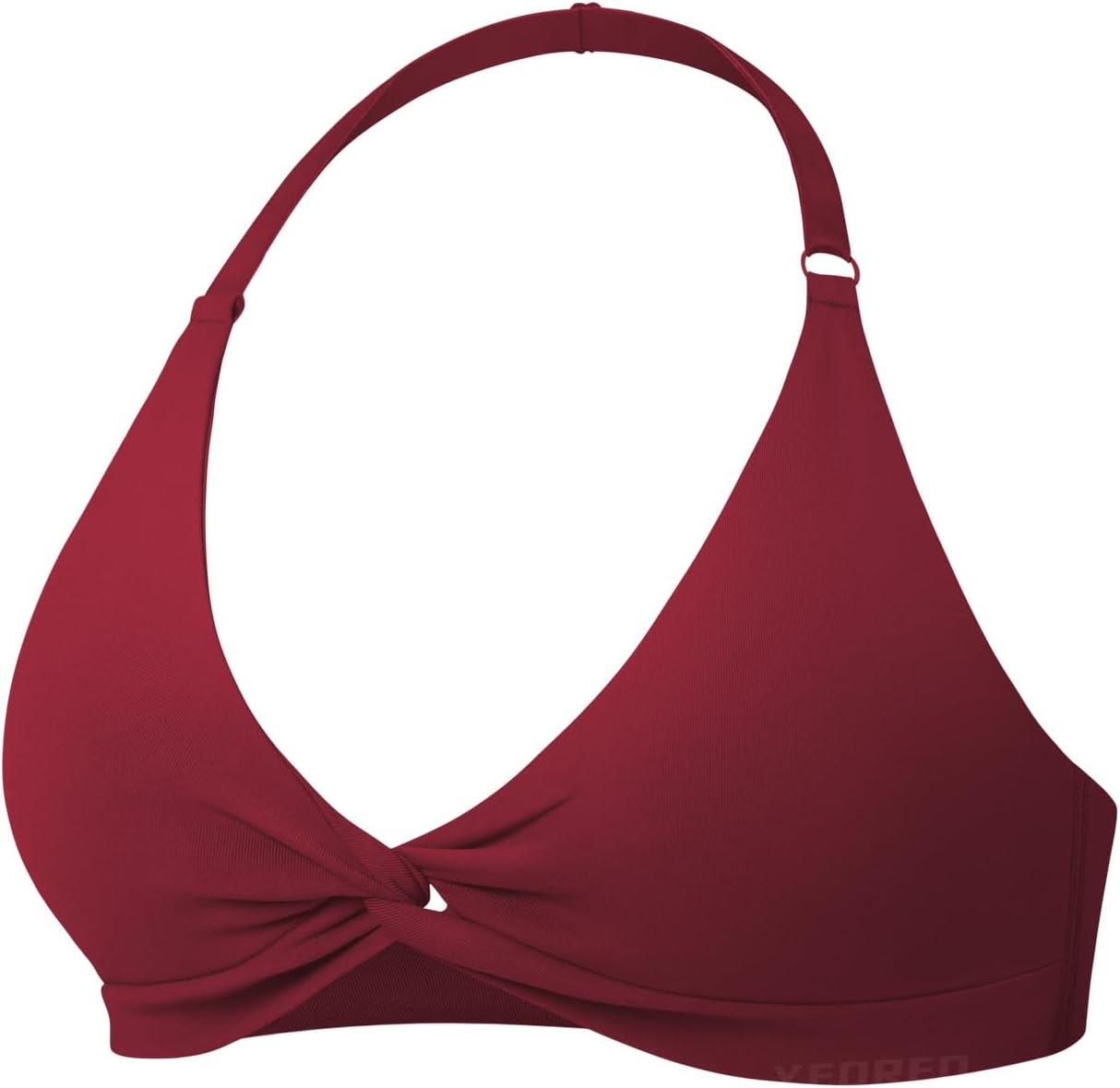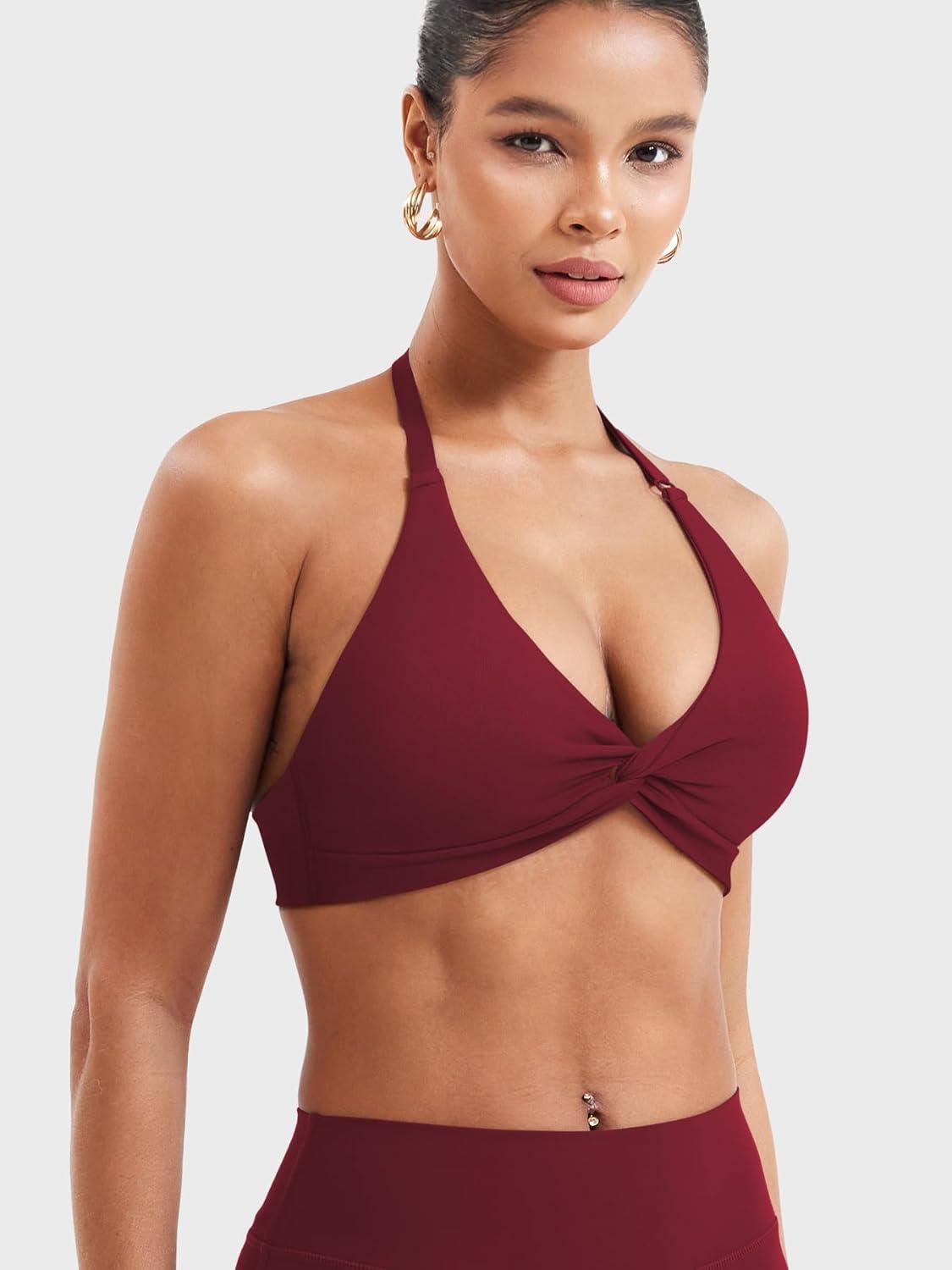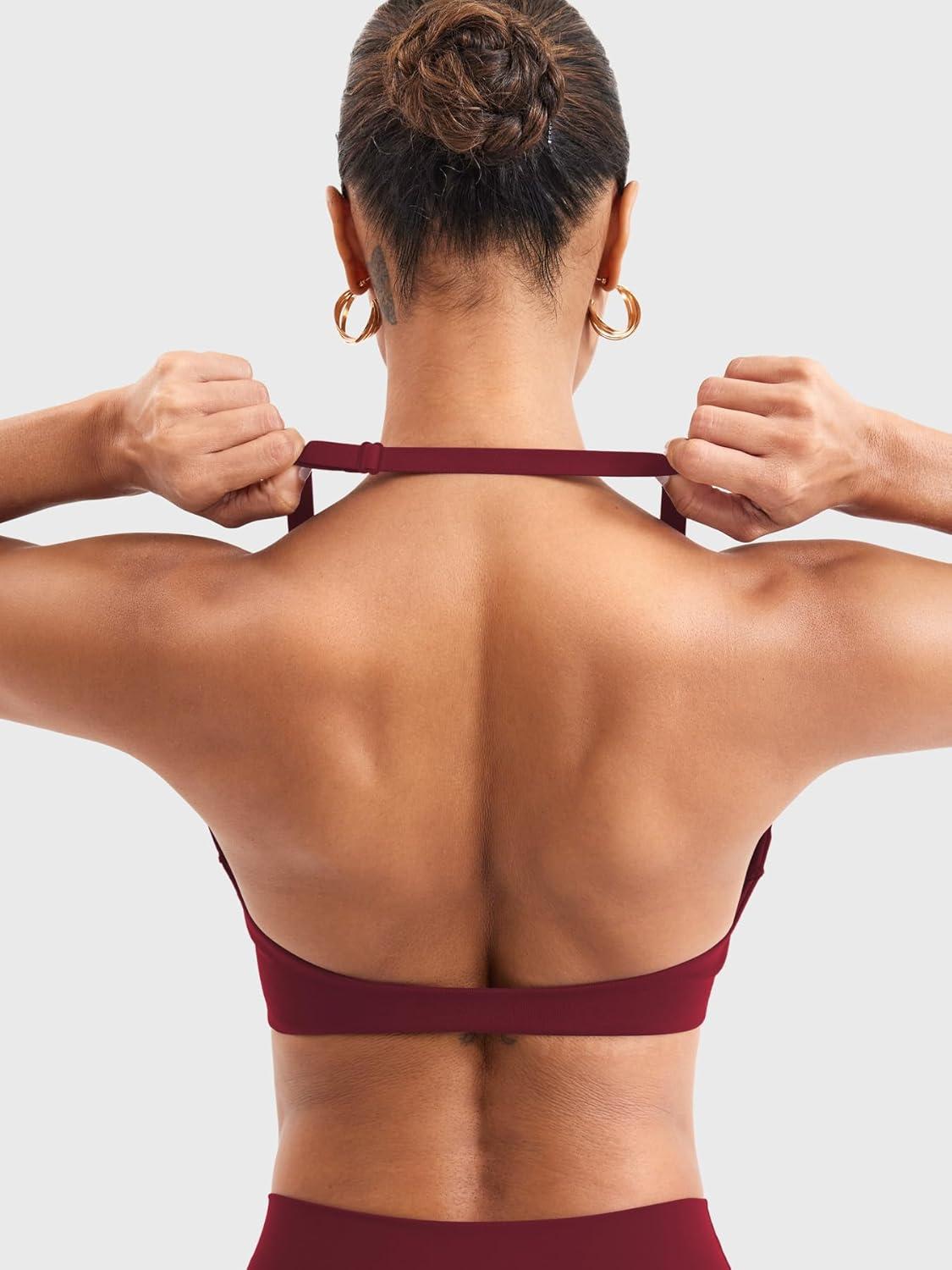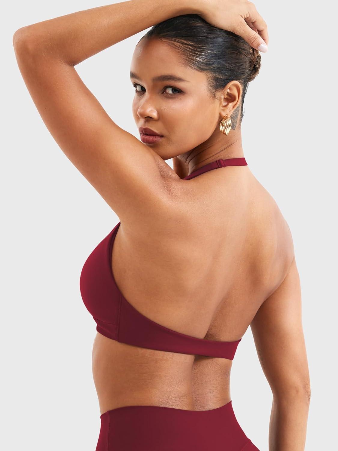YEOREO Halter Sports Bras for Women Low Impact Removable Padded Adjustable Deep V Bra Seamless Workout Gym Crop Tops(Scarlett Red)