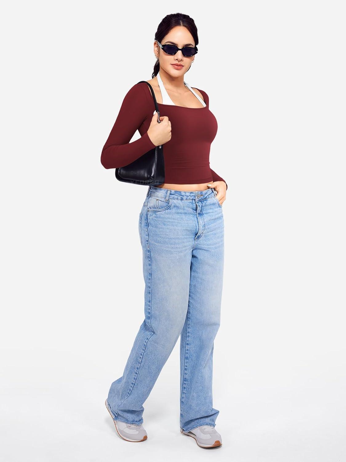 YEOREO Long Sleeve Shirts for Women Fitted Workout Tops Double Lined Basic Undershirt Square Neck Y2K Going Out Tops(Anchor Red)