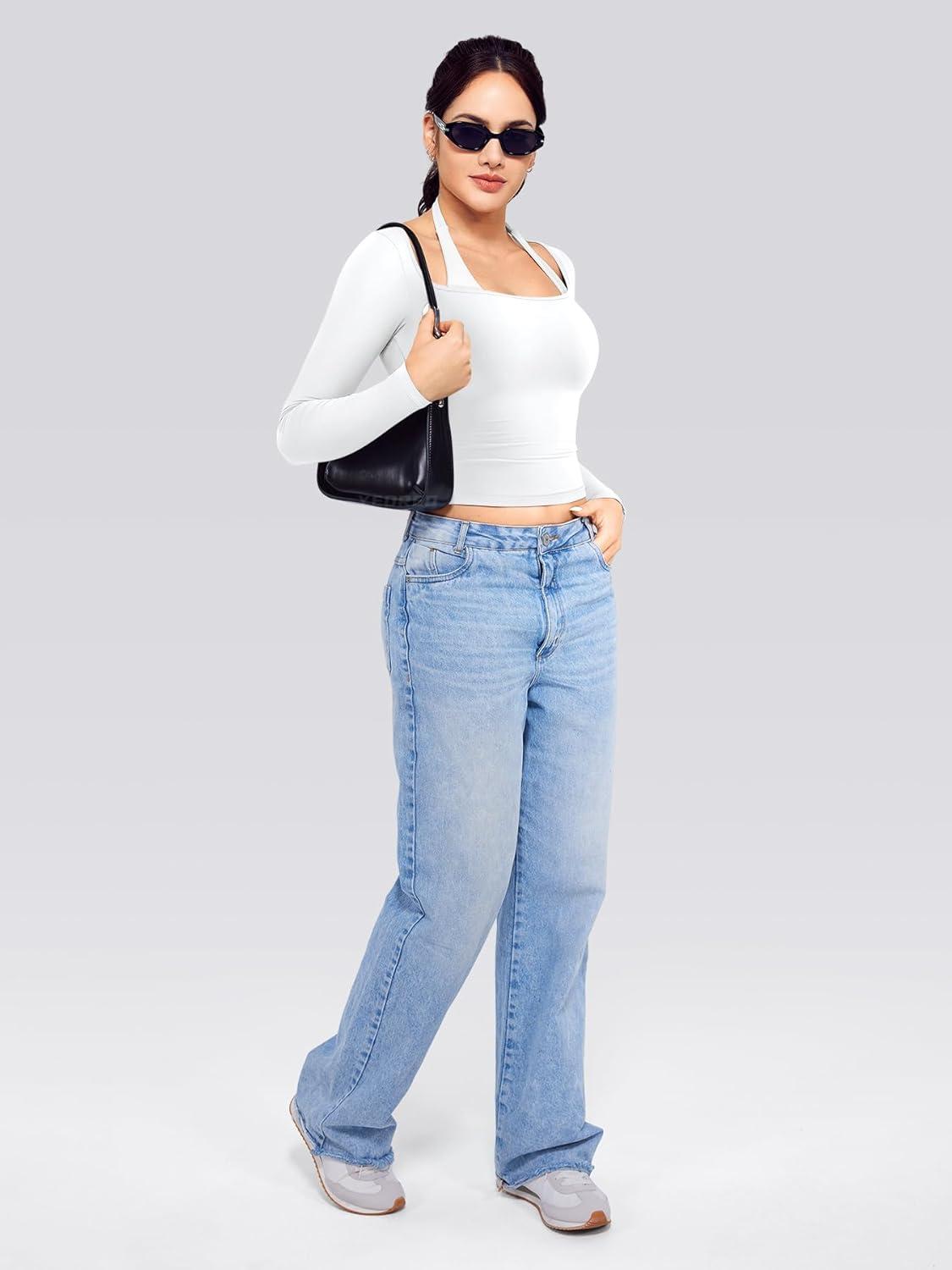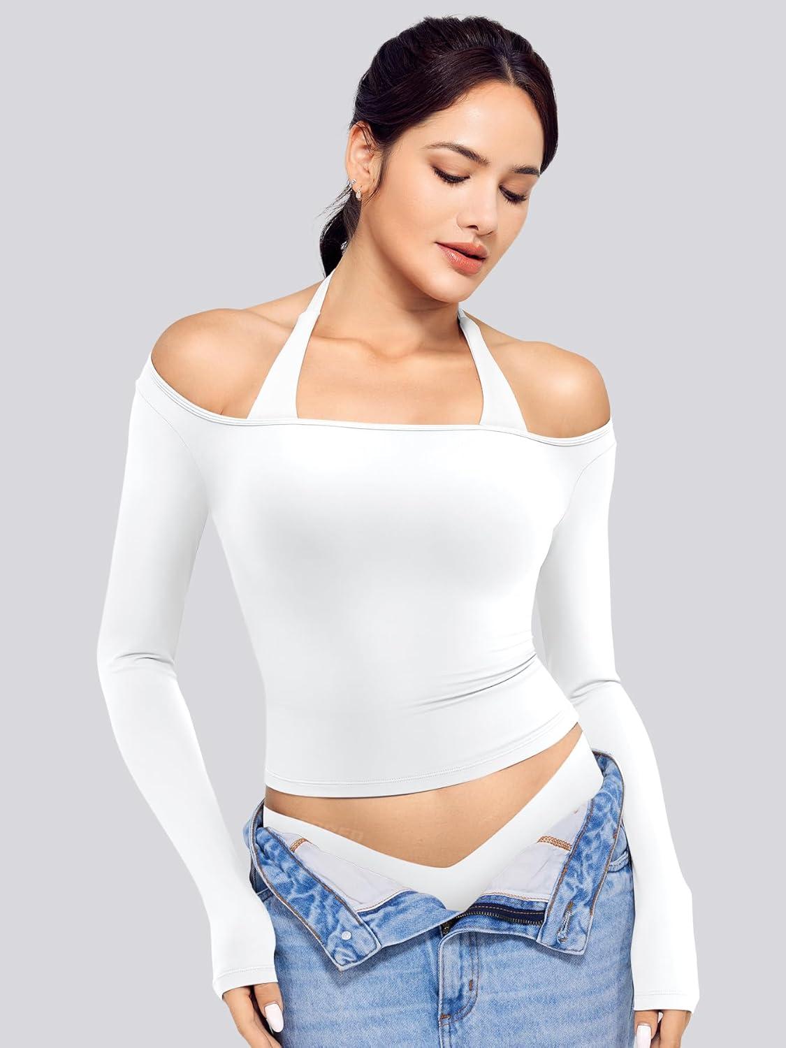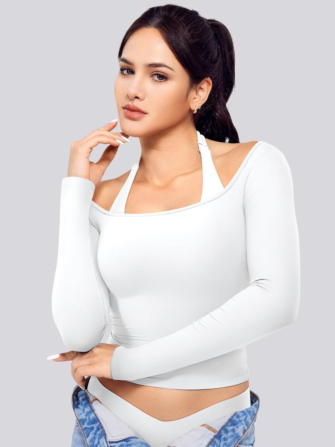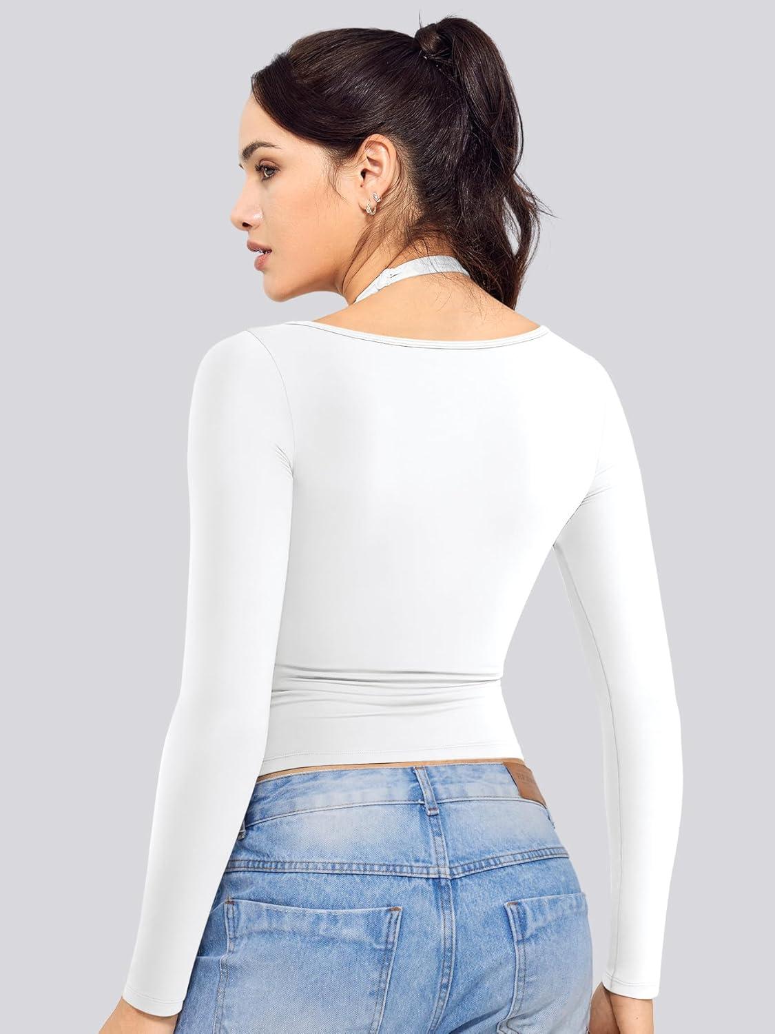 YEOREO Long Sleeve Shirts for Women Fitted Workout Tops Double Lined Basic Undershirt Square Neck Y2K Going Out Tops(White)