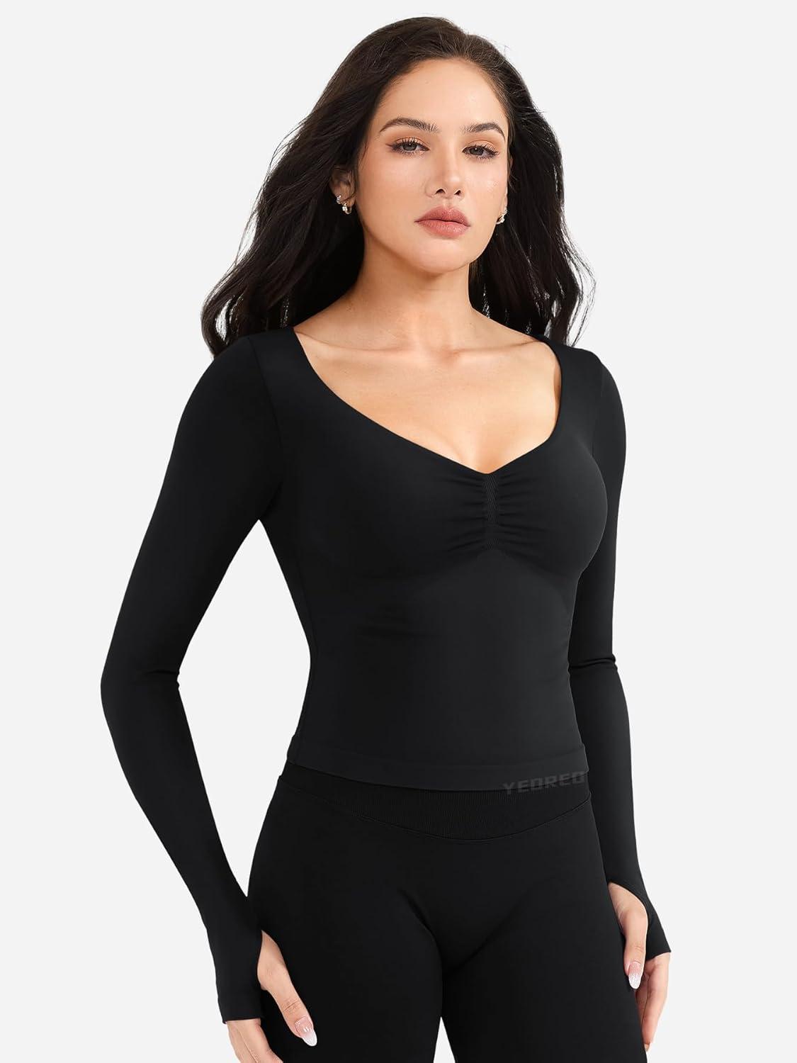 YEOREO Long Sleeve Workout Tops for Women Padded Deep V Neck Double Lined Impact Tops Agniee Slim Fit Gym Athletic Shirts(Black)