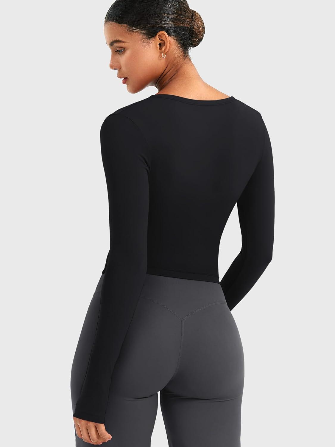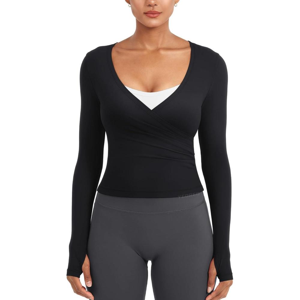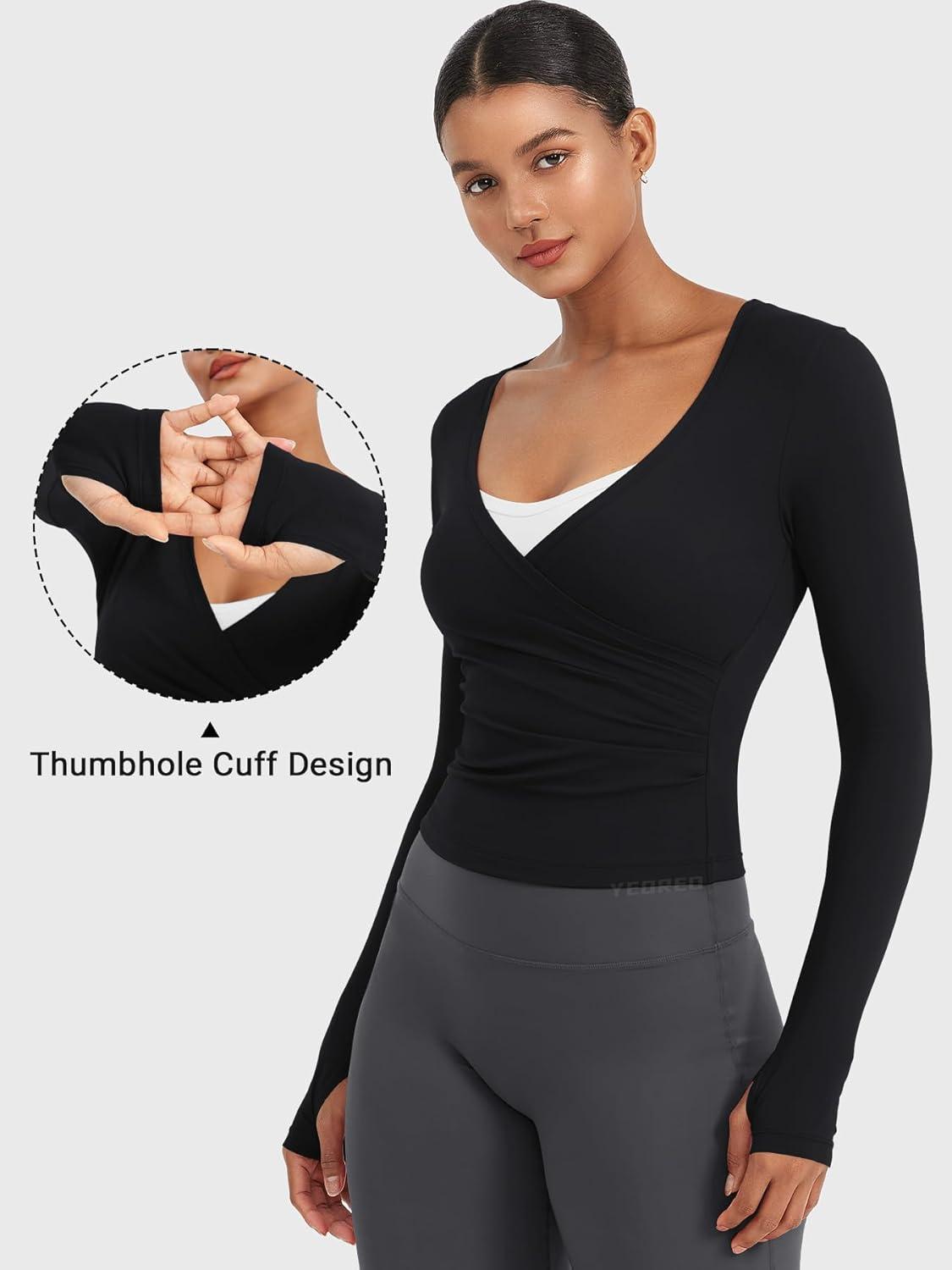 YEOREO Minniy Women Wrap Long Sleeve with Thumb Loops V Neck Basic Workout Shirts for Yoga Pilates Going Out Shrug Blouse(Black)