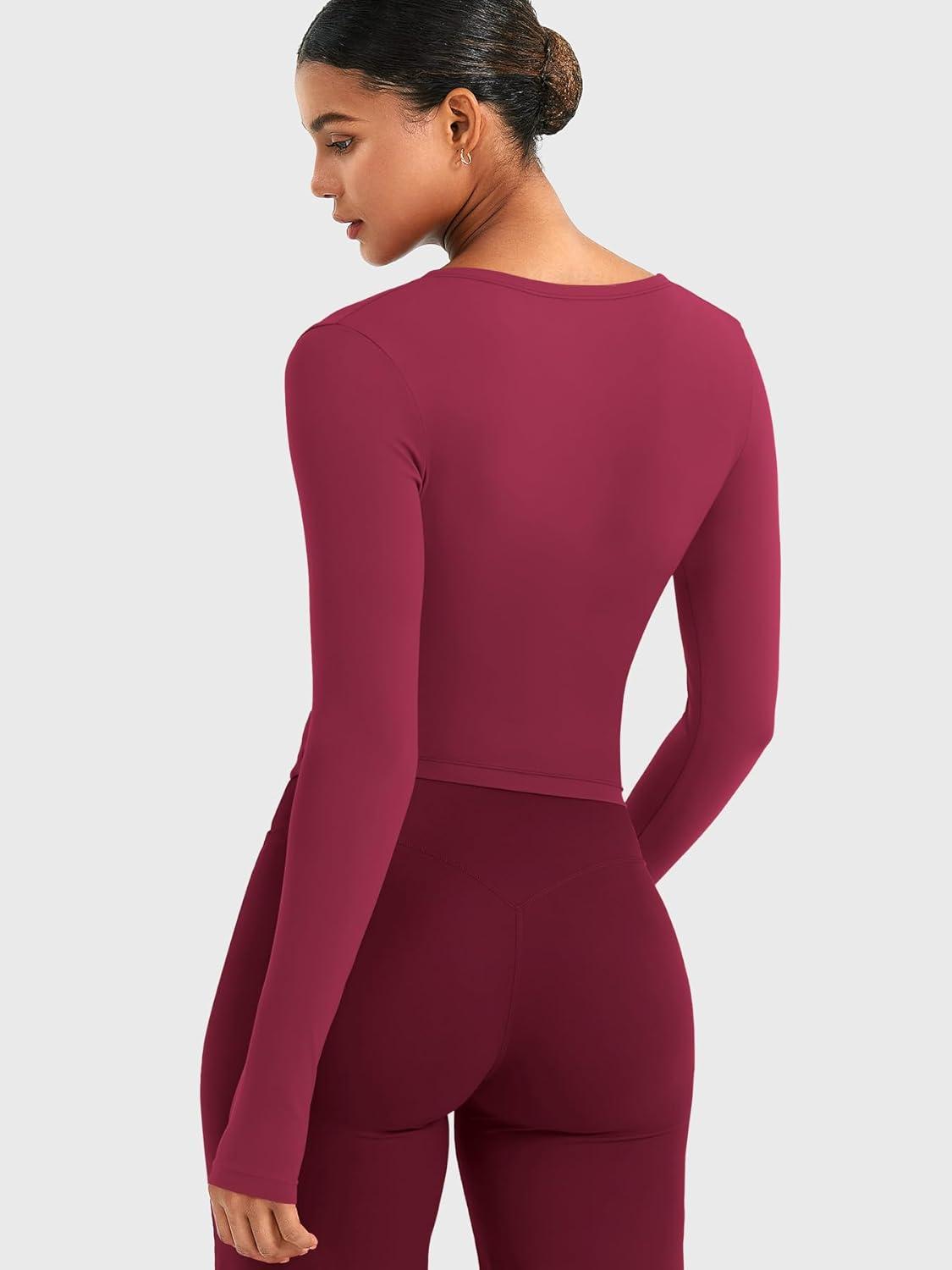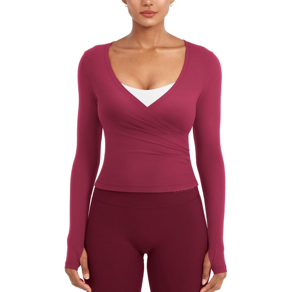 YEOREO Minniy Women Wrap Long Sleeve with Thumb Loops V Neck Basic Workout Shirts for Yoga Pilates Going Out Shrug Blouse(Ruby Red)