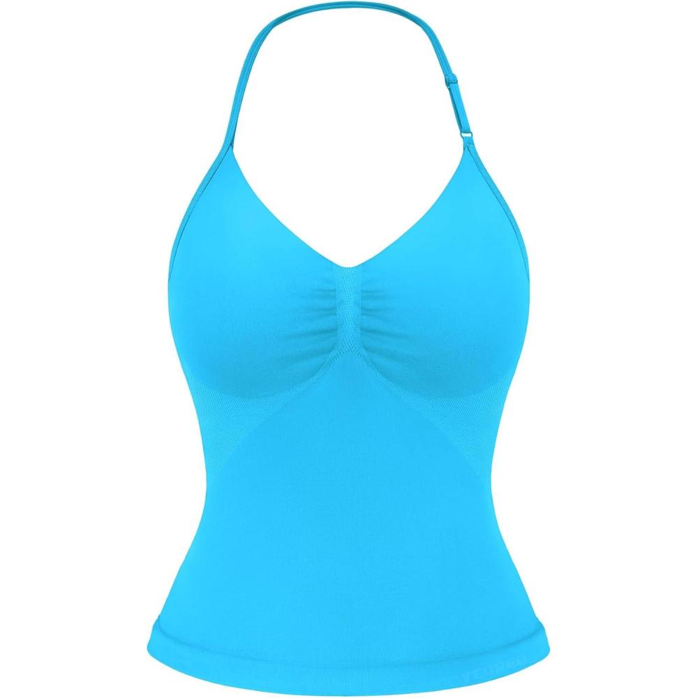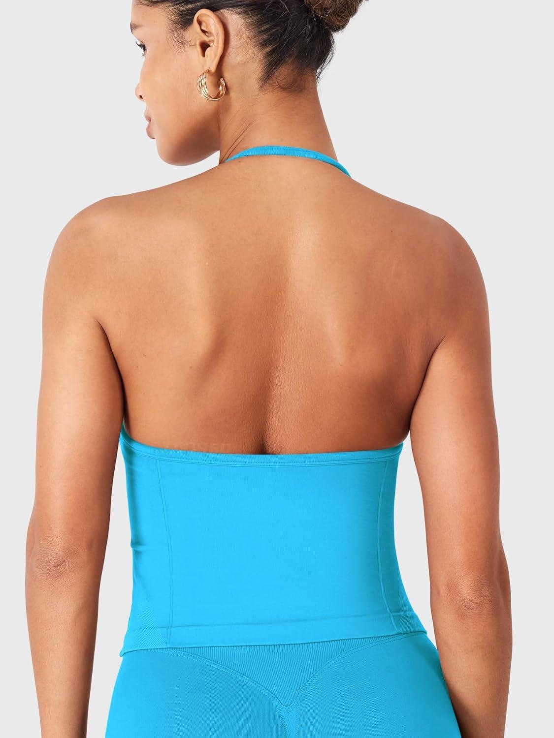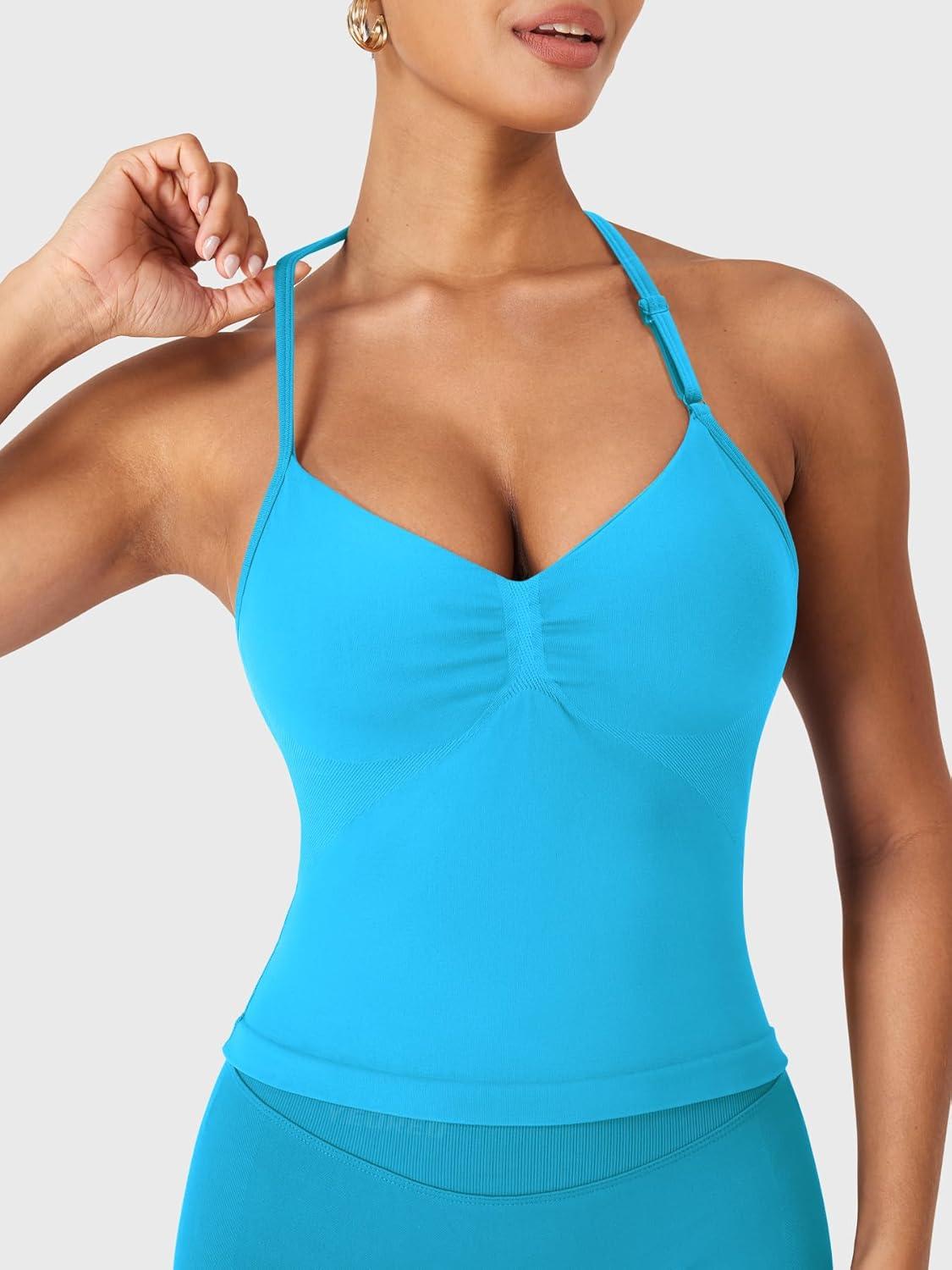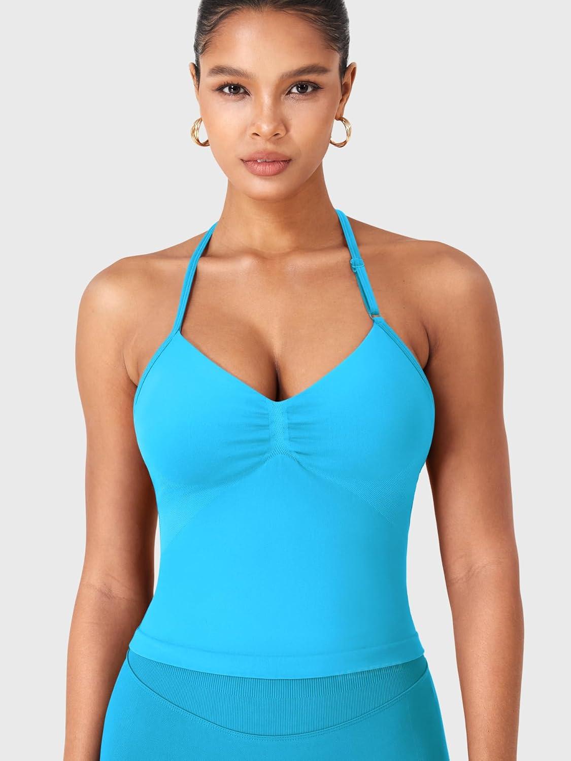 YEOREO SoftHue Impact Longline Strappy Top Women’s Halter Workout Tank Tops Backless Gym Longline with Adjustable Strap(Caneel Bay)