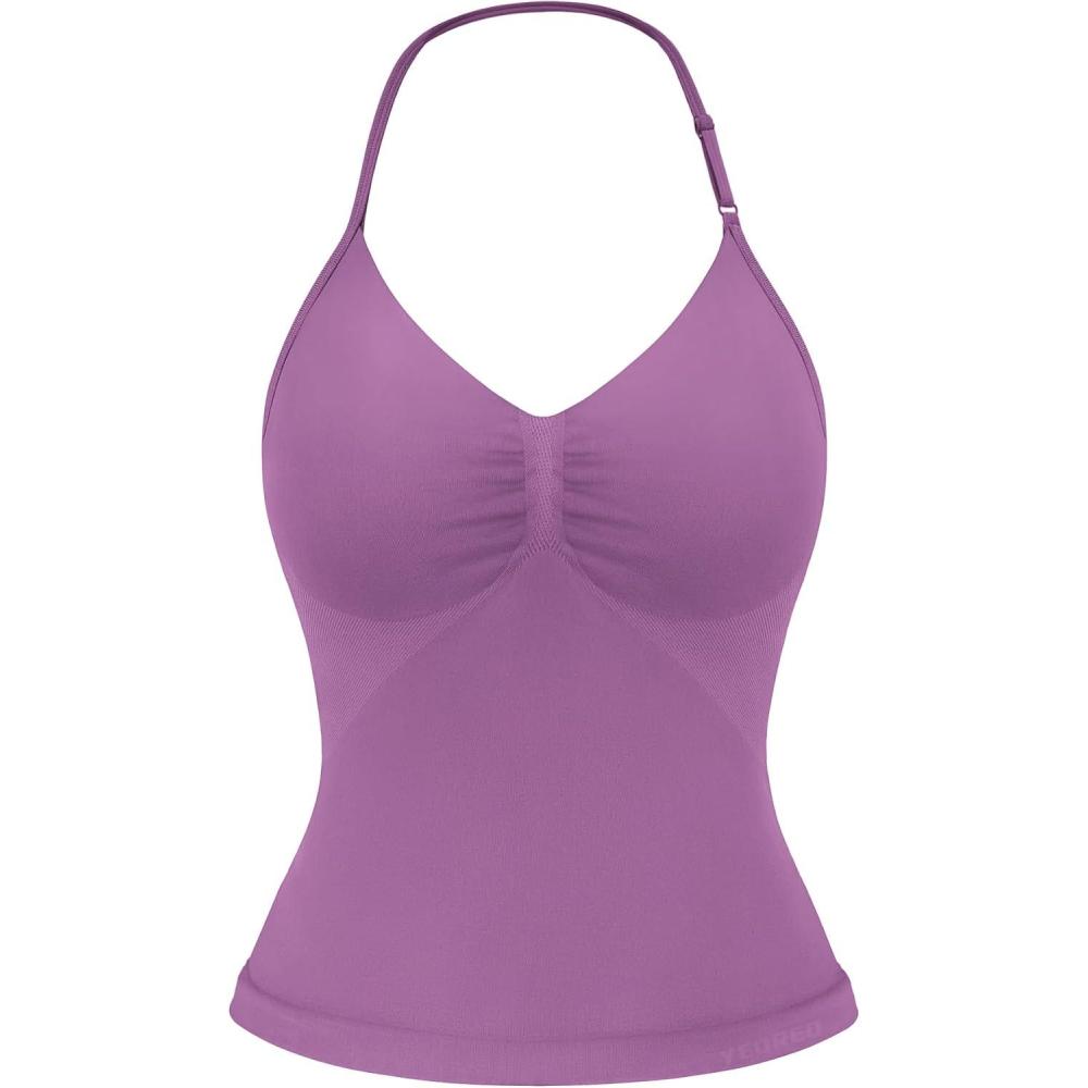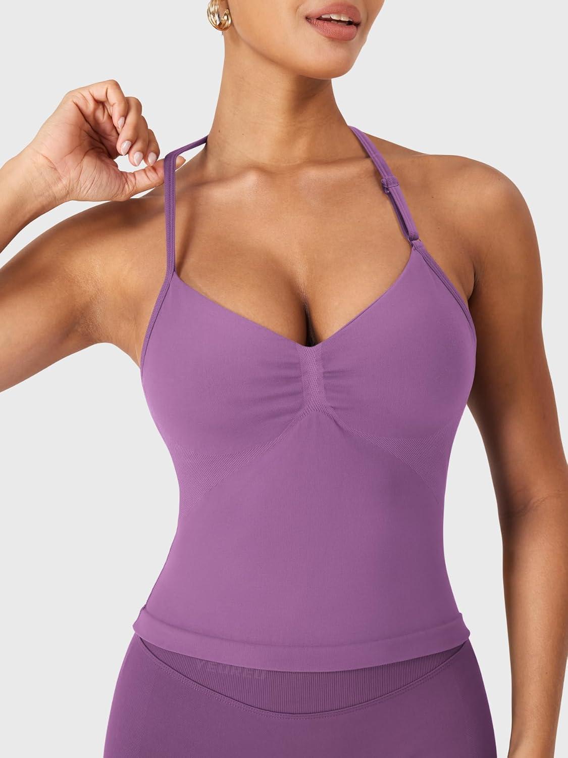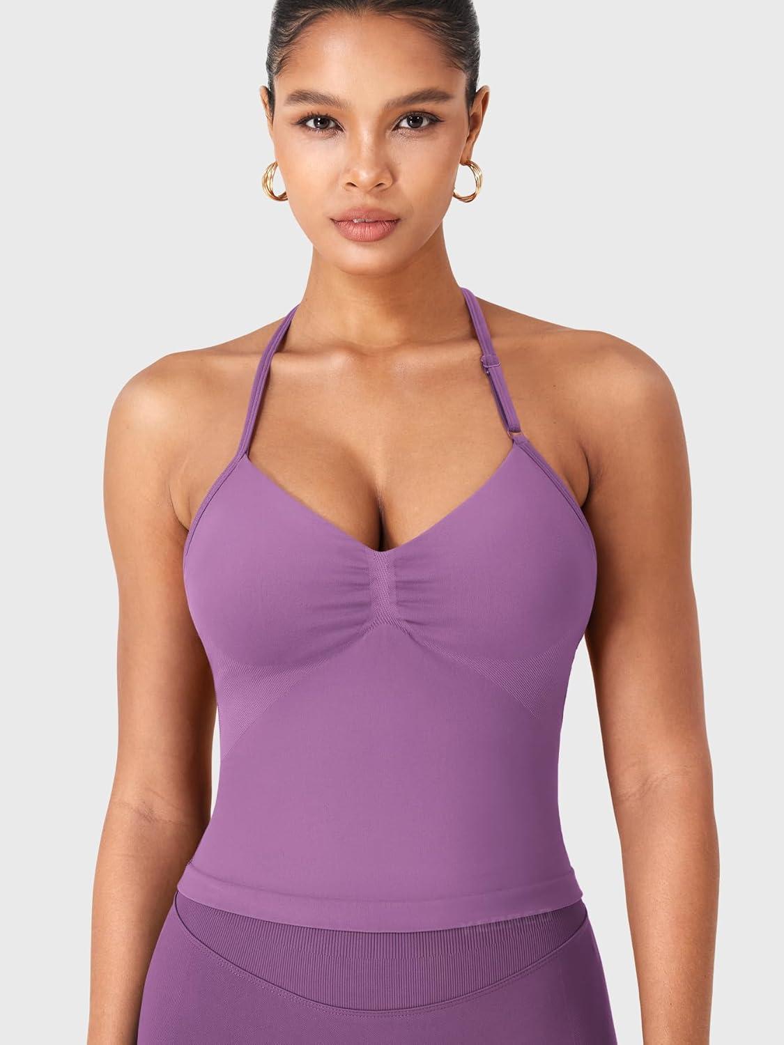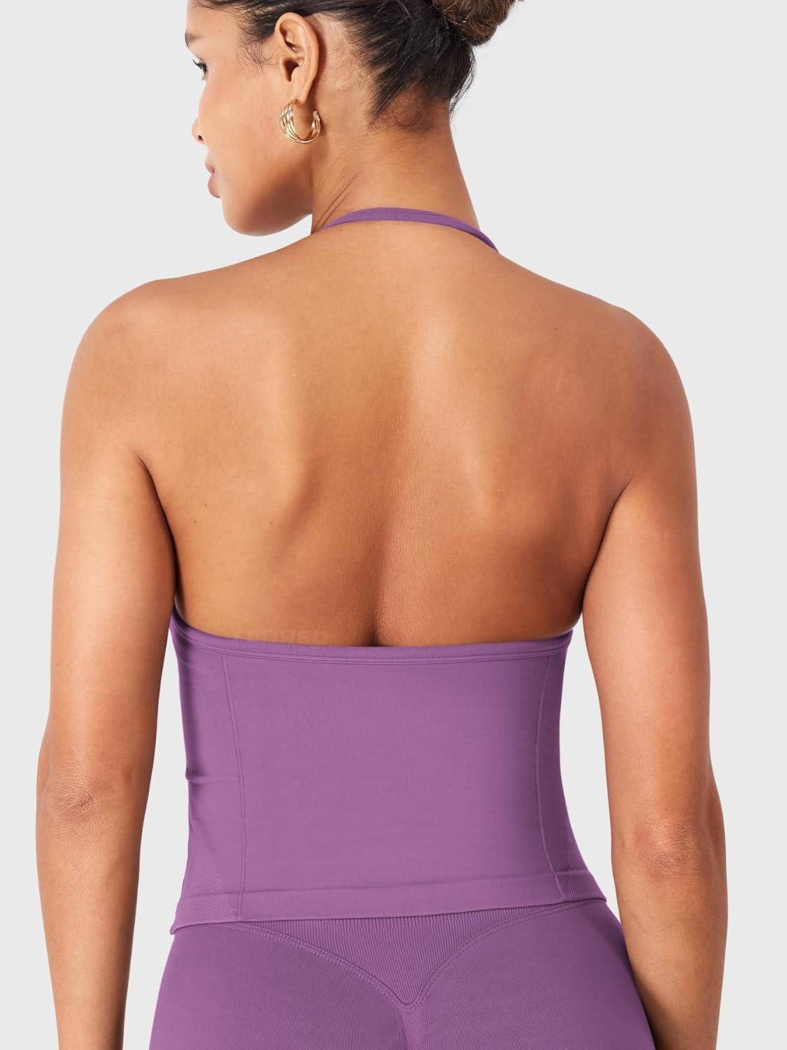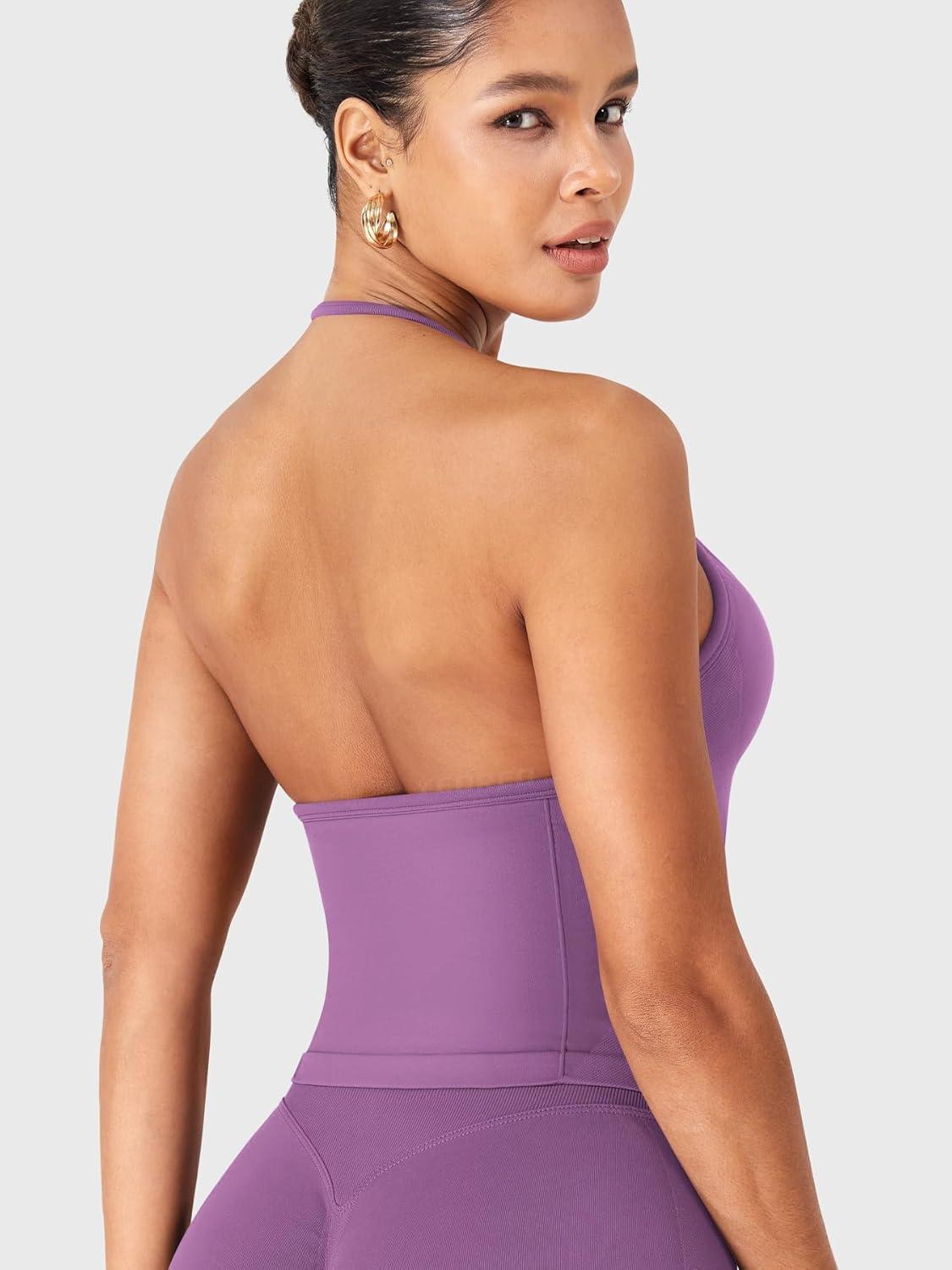 imageYEOREO SoftHue Impact Longline Strappy Top Womens Halter Workout Tank Tops Backless Gym Longline with Adjustable StrapGrape