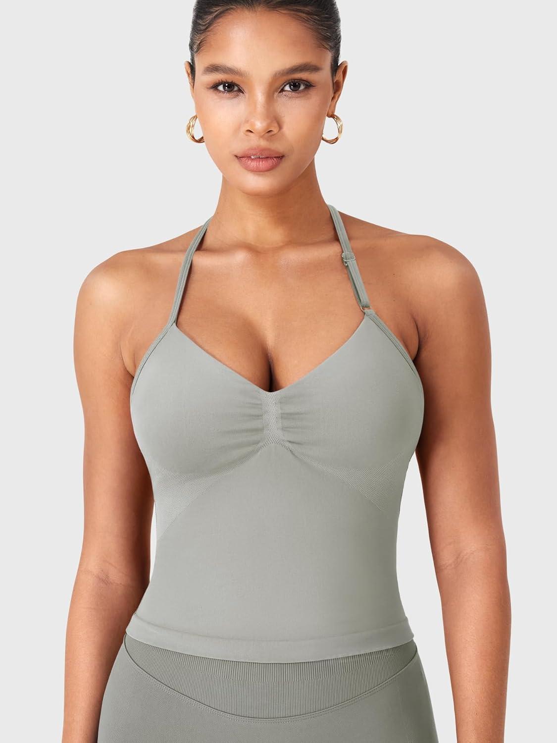 imageYEOREO SoftHue Impact Longline Strappy Top Womens Halter Workout Tank Tops Backless Gym Longline with Adjustable StrapLight Gray