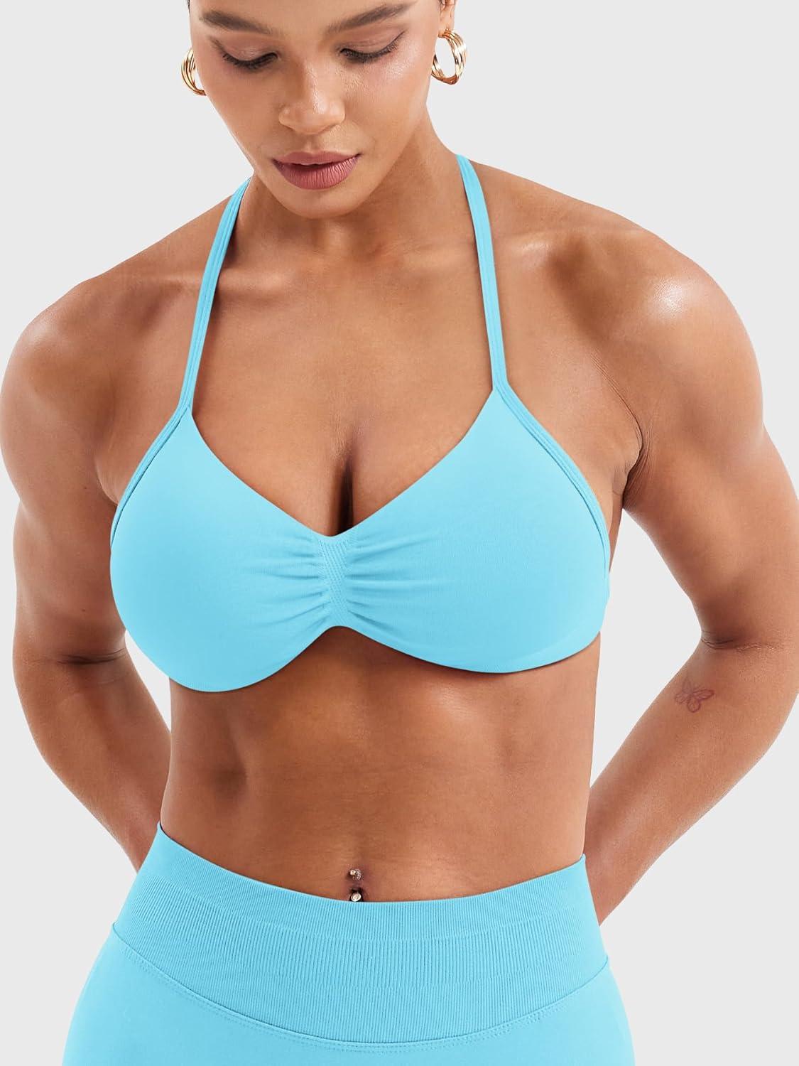 imageYEOREO SoftHue Impact Strappy Halter Bra for Sports Intensify Women Workout Backless Padded Gym Yoga BraLight Blue