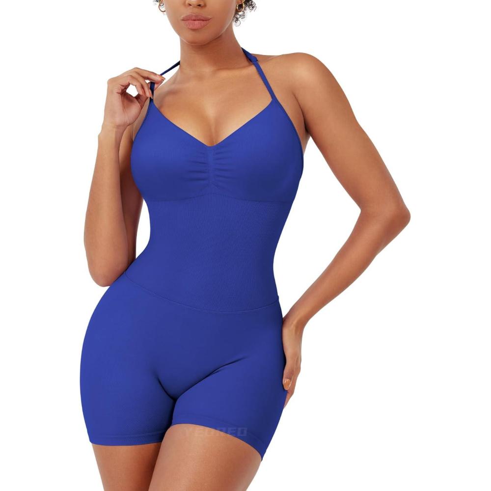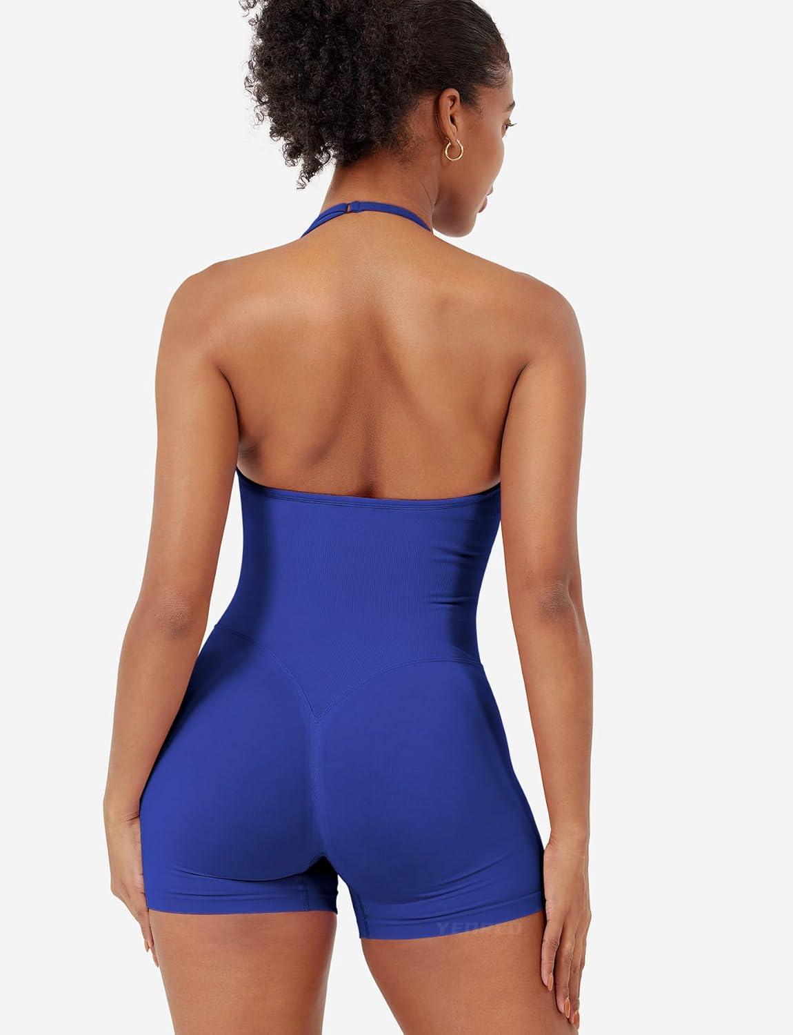 YEOREO SoftHue One Piece Workout Jumpsuits for Women Halter Backless Short Jumpsuit Sleeveless Ribbed Bodycon Gym Yoga Romper(Deep Sea)