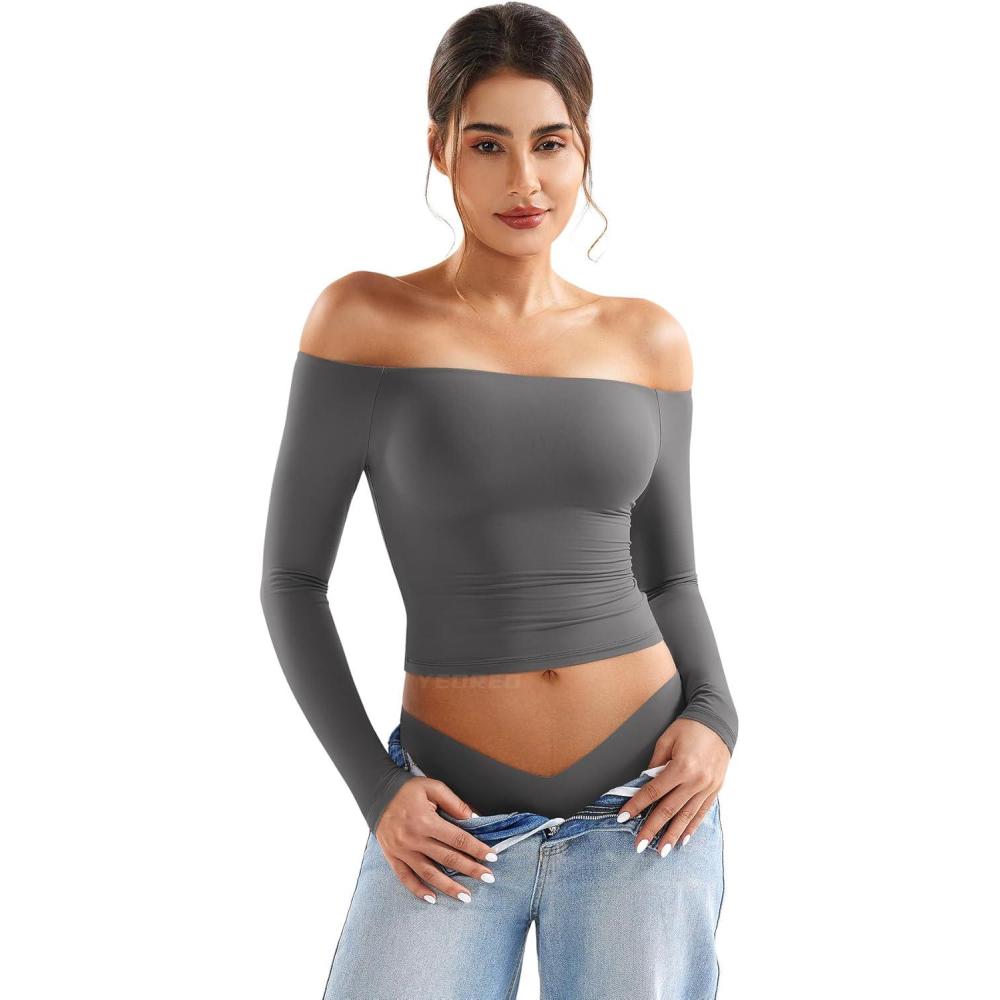 YEOREO Sophie Women Off Shoulder Long Sleeve Shirts Double Lined Basic Undershirt Y2K Going Out Tops(Grey)