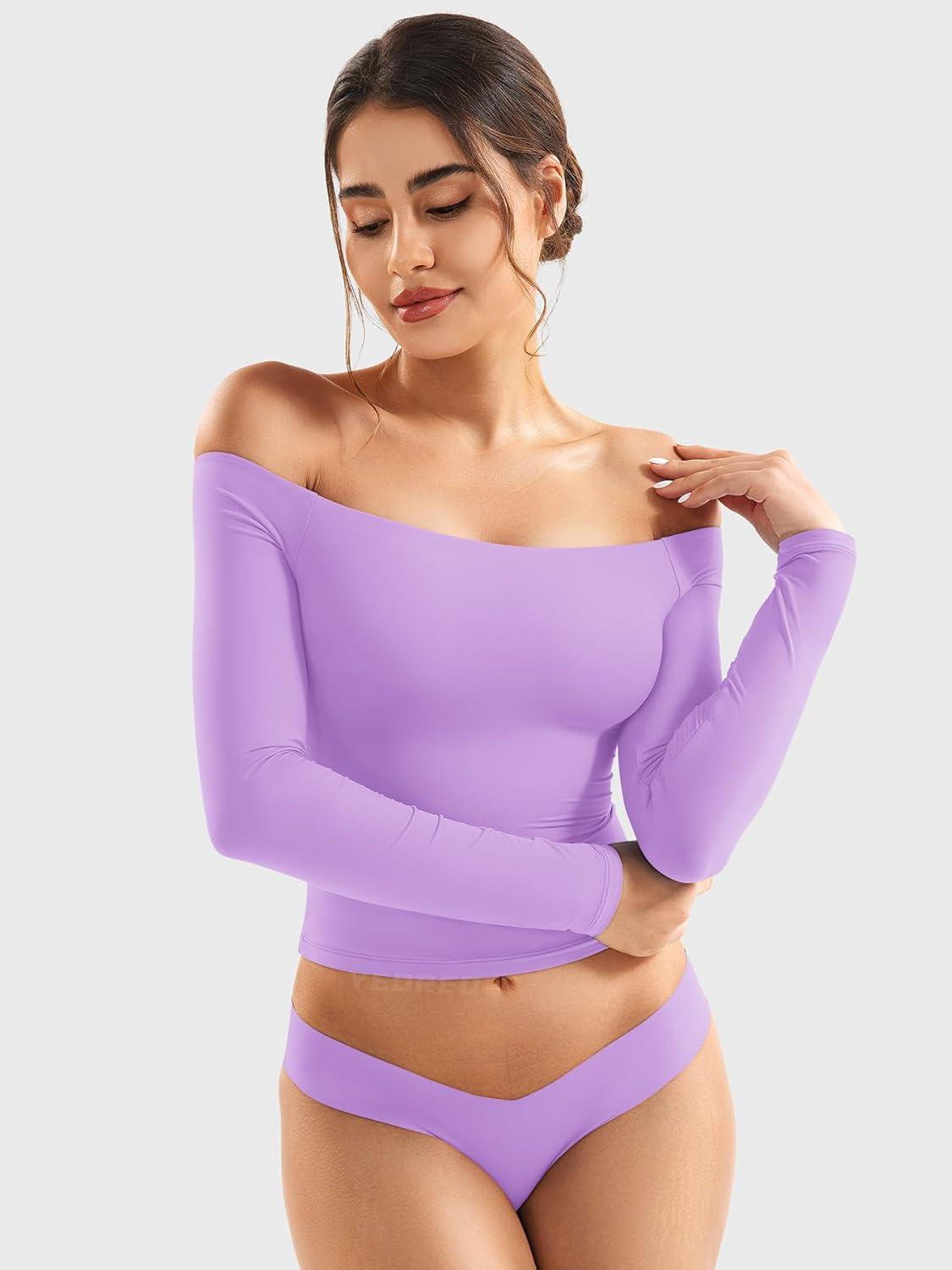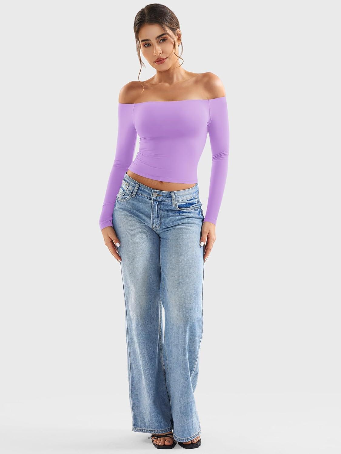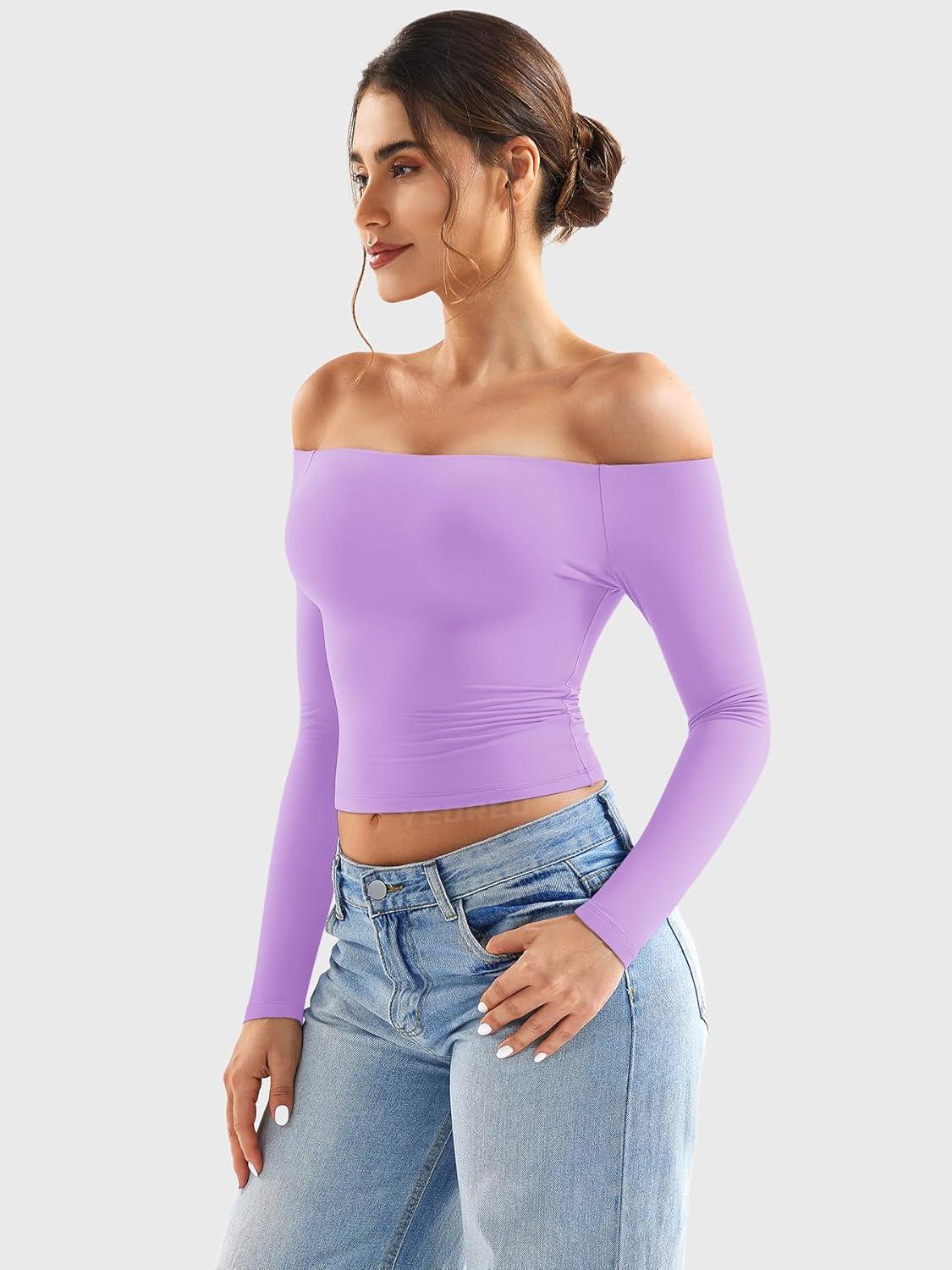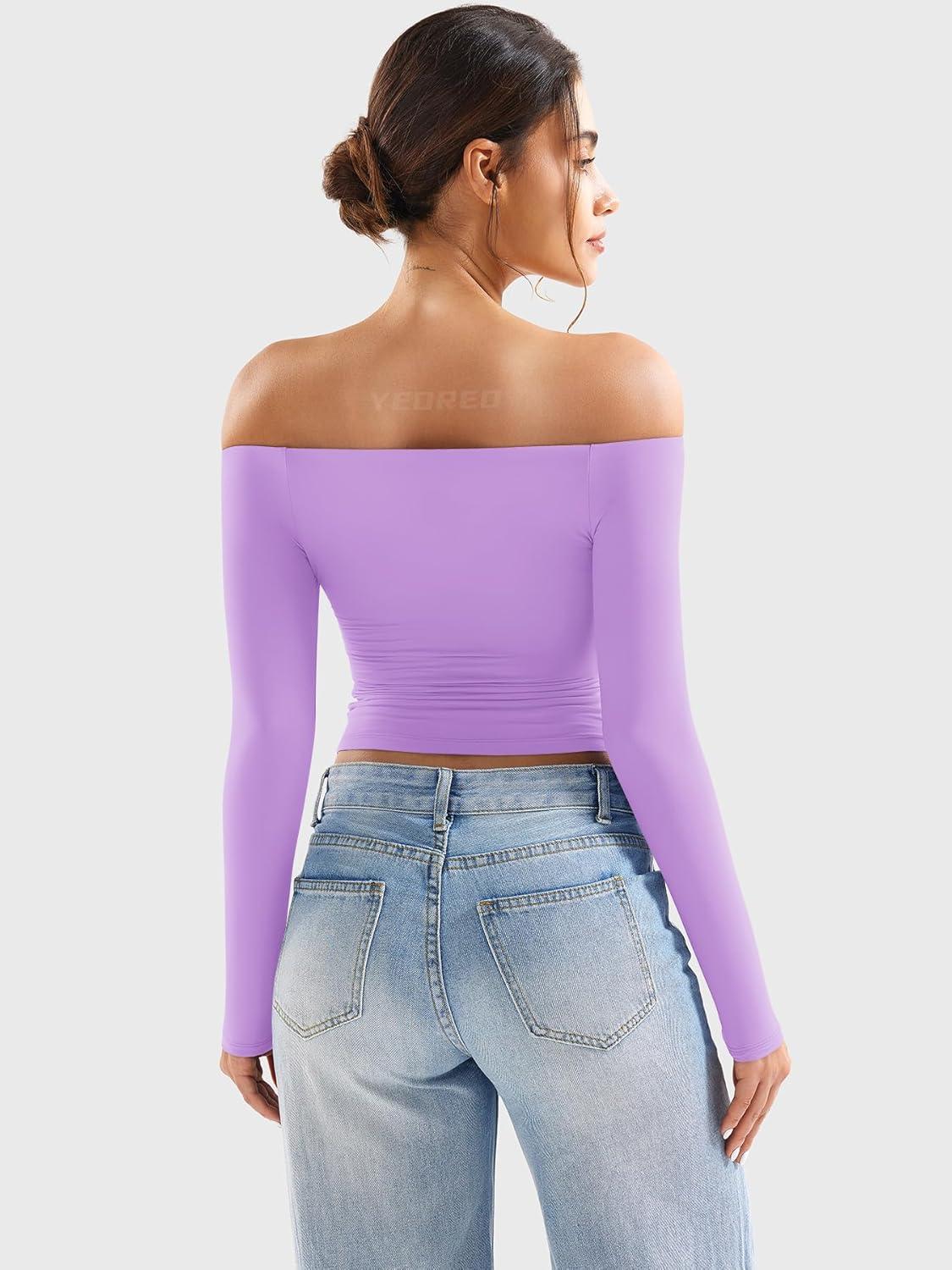 YEOREO Sophie Women Off Shoulder Long Sleeve Shirts Double Lined Basic Undershirt Y2K Going Out Tops(Lilac)