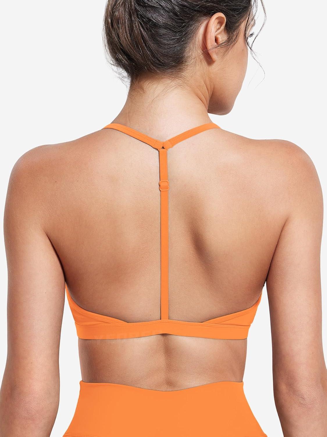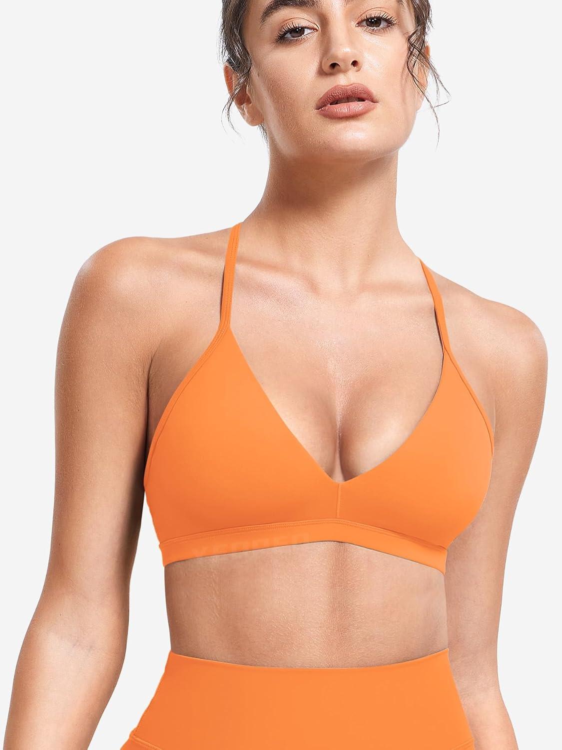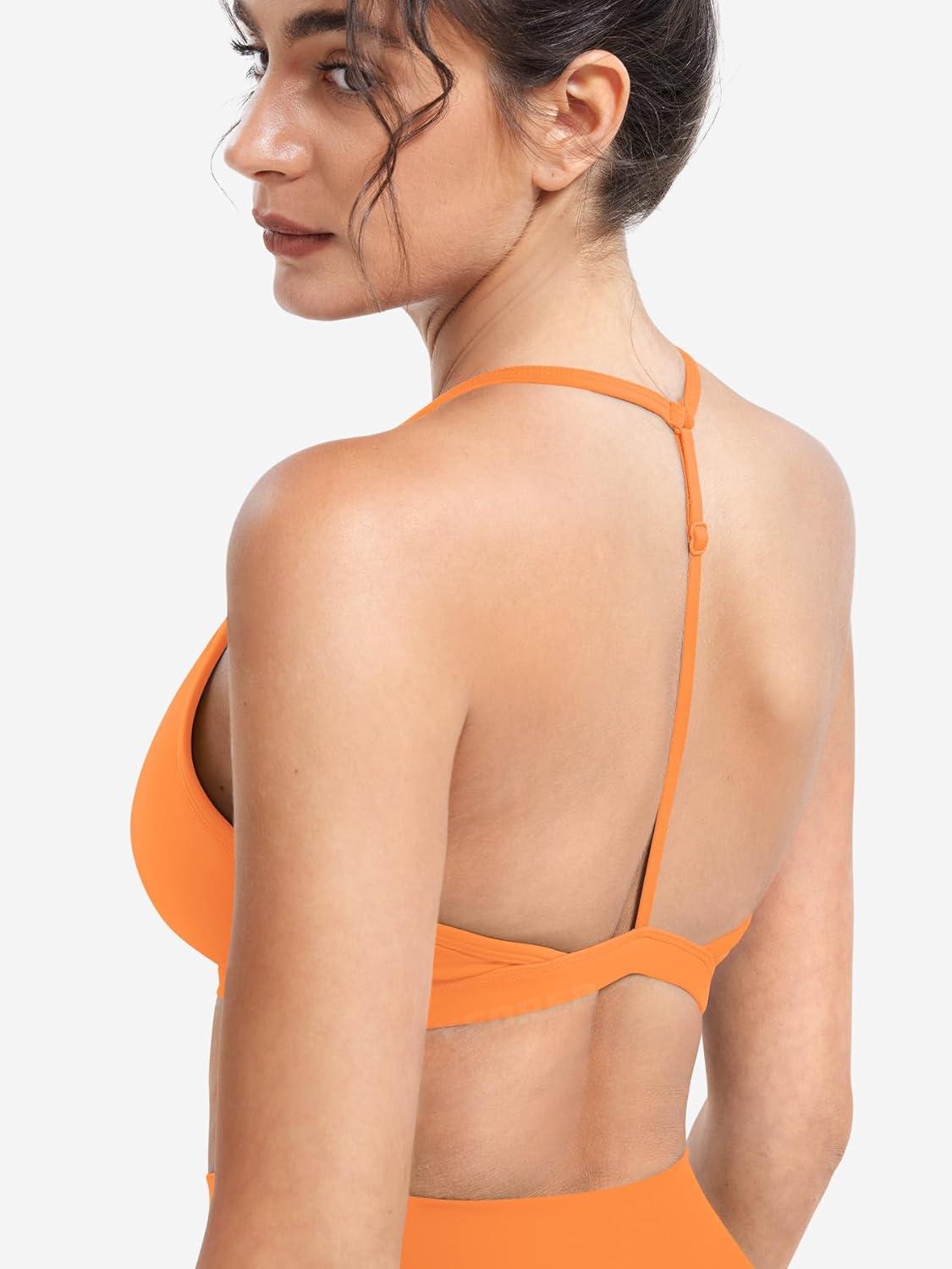 YEOREO Sports Bras for Women Strappy Padded Halter Ericie Open Back Light Impact Deep V Neck Yoga Workout Gym Tops(Orange)