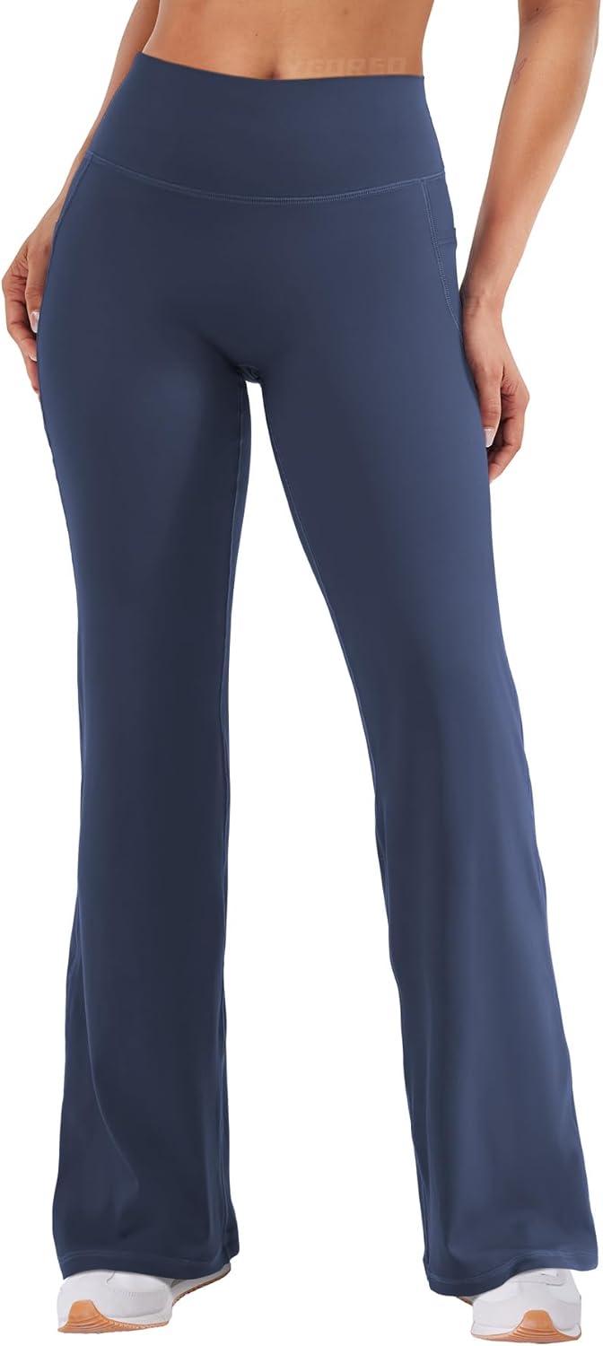 YEOREO Straight Leggings with Pockets for Women No Front Seam Workout Leggings High Waist Wide Leg Yoga Pants – 29″/ 31.5″(Navy)