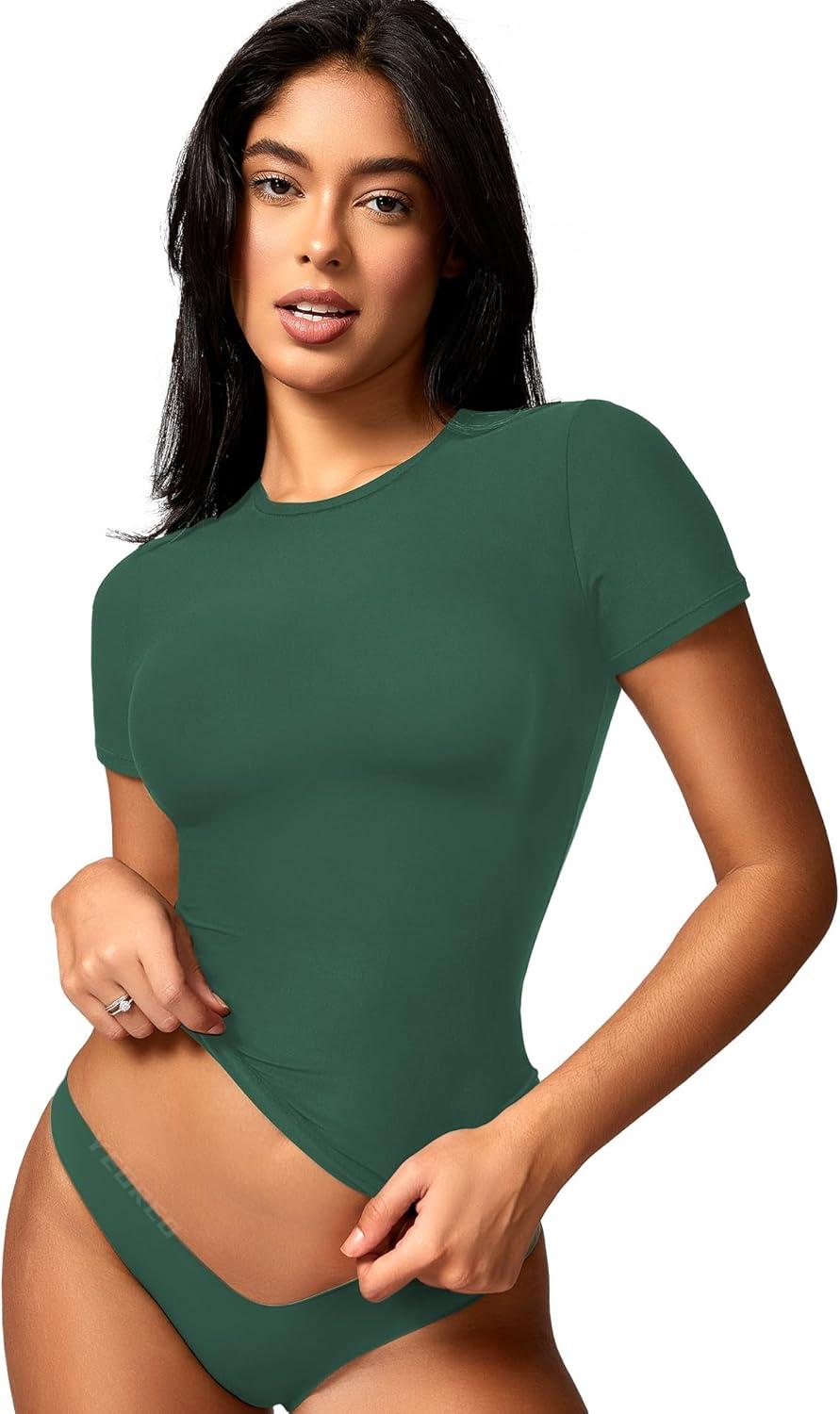 YEOREO Women Fitted Workout Tops Short Sleeve Double Lined Basic Y2K Going Out Crew Neck Compression Crop Top(Dark Green)