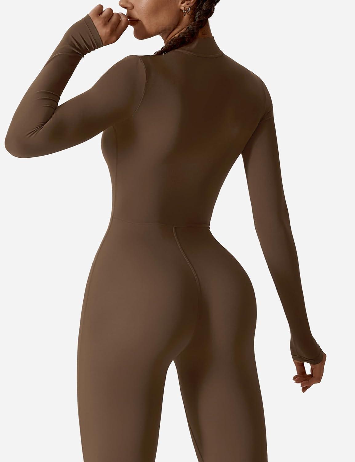YEOREO Women Long Sleeve Workout Jumpsuit Zip Up Romper Bottom Pants Bodysuit Bodycon Sexy One Piece(Coffee)