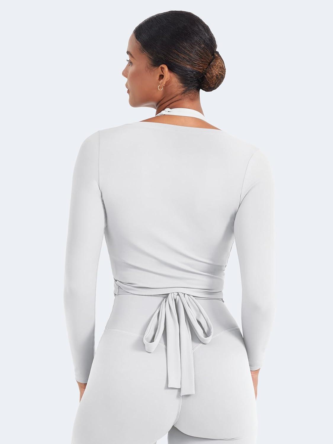 YEOREO Women Pilates Wrap Top Long Sleeve Tie Ballet Workout Yoga Shirt Michelie Y2K V Neck Cropped Tops(White)