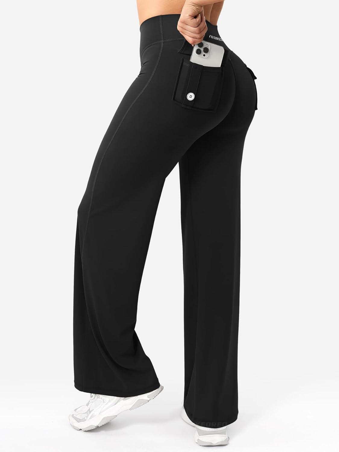 YEOREO Women Workout Straight Leggings with Pockets Hidden Scrunch High Waist Casiey Cargo Gym Yoga Wide Leg Sweatpants(Black)