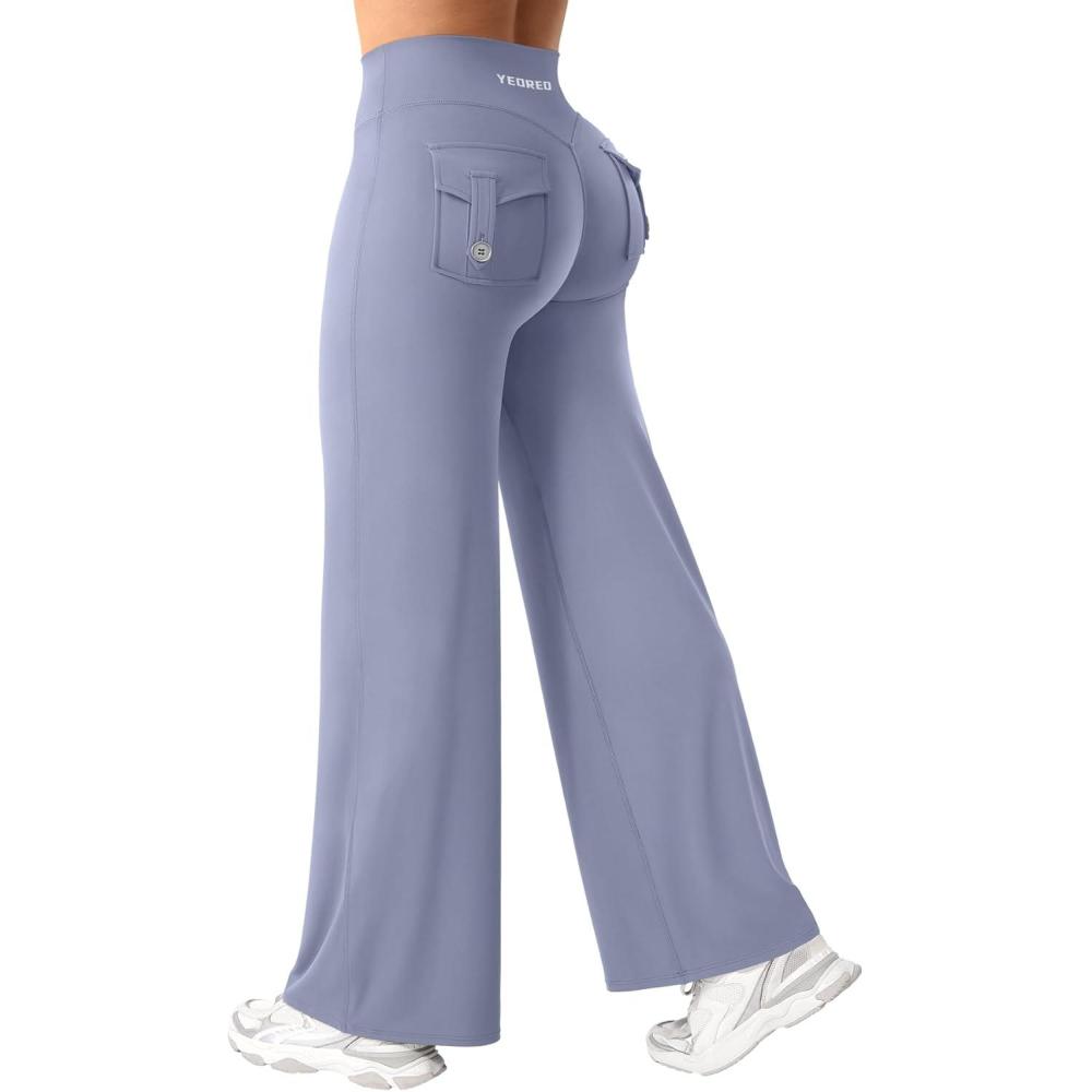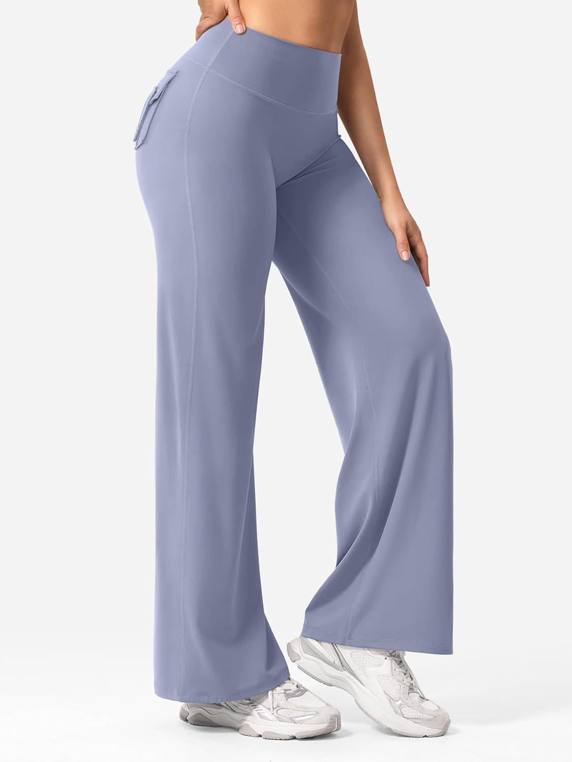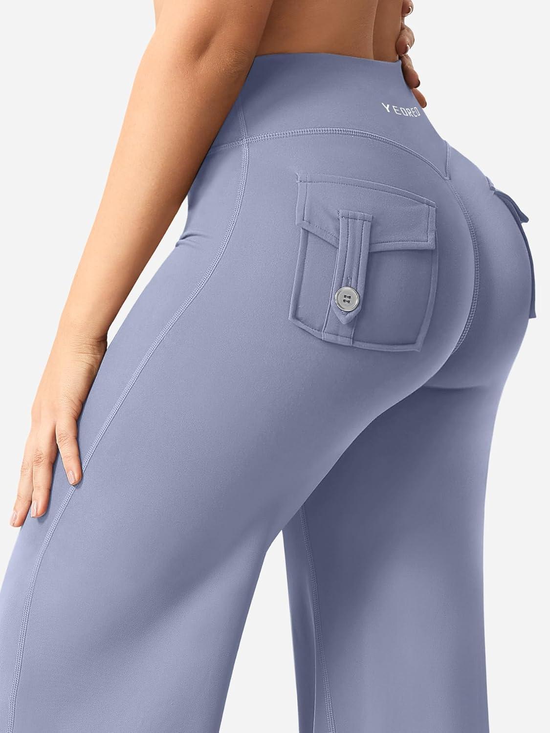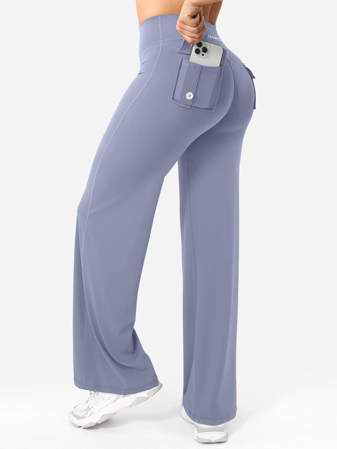 YEOREO Women Workout Straight Leggings with Pockets Hidden Scrunch High Waist Casiey Cargo Gym Yoga Wide Leg Sweatpants(Granite Blue)