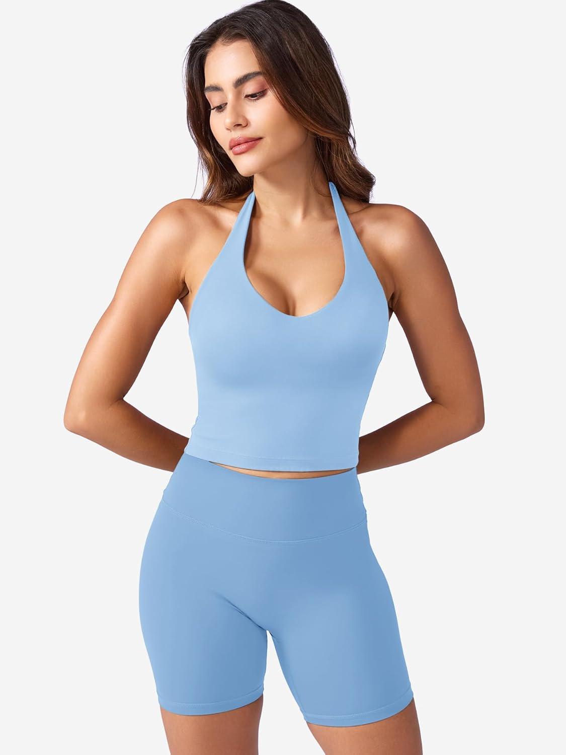 YEOREO Women's Halter Crop Top V Neck Workout Going Out Tank Top Hazel Padded Sleeveless Backless Trendy Summer Camisole(Airy Blue)