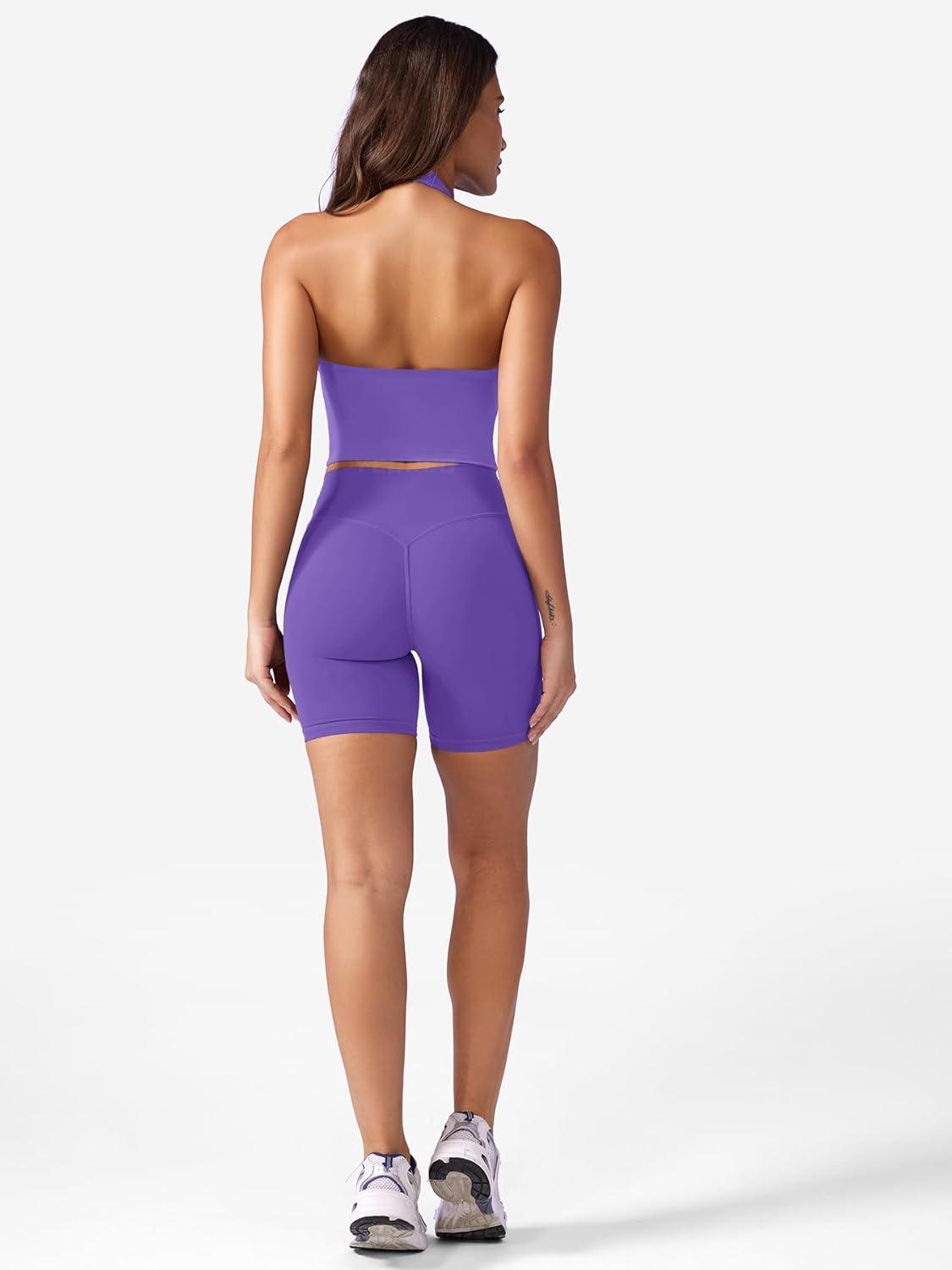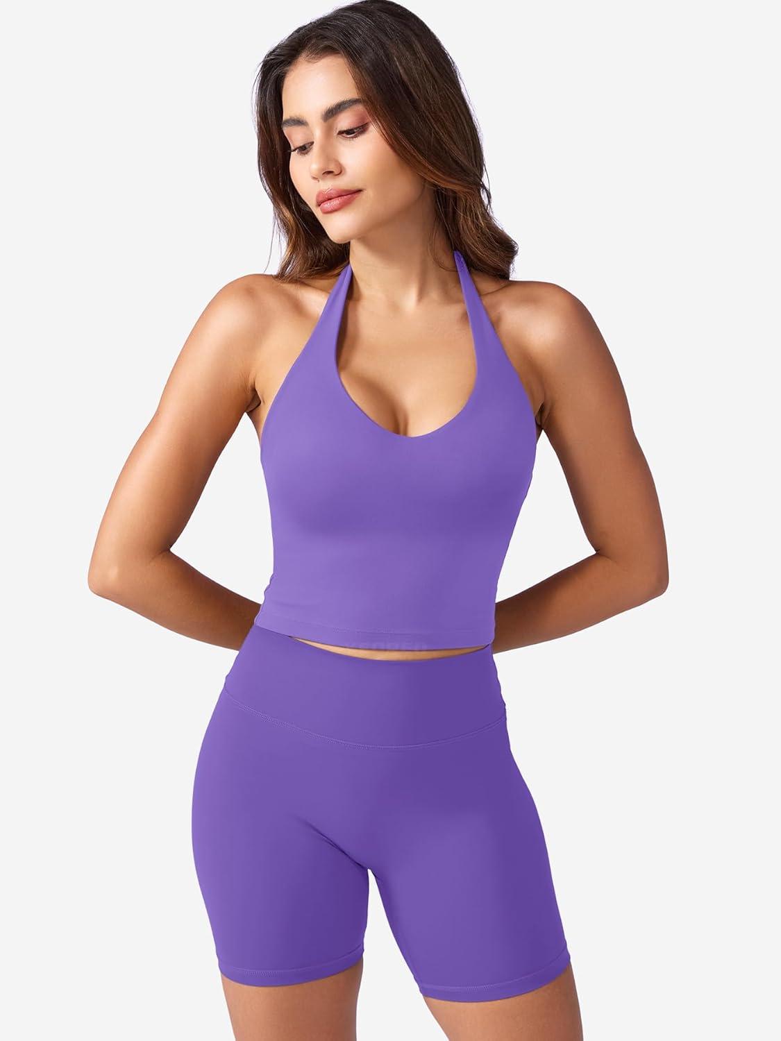 imageYEOREO Womens Halter Crop Top V Neck Workout Going Out Tank Top Hazel Padded Sleeveless Backless Trendy Summer CamisoleDahlia Purple
