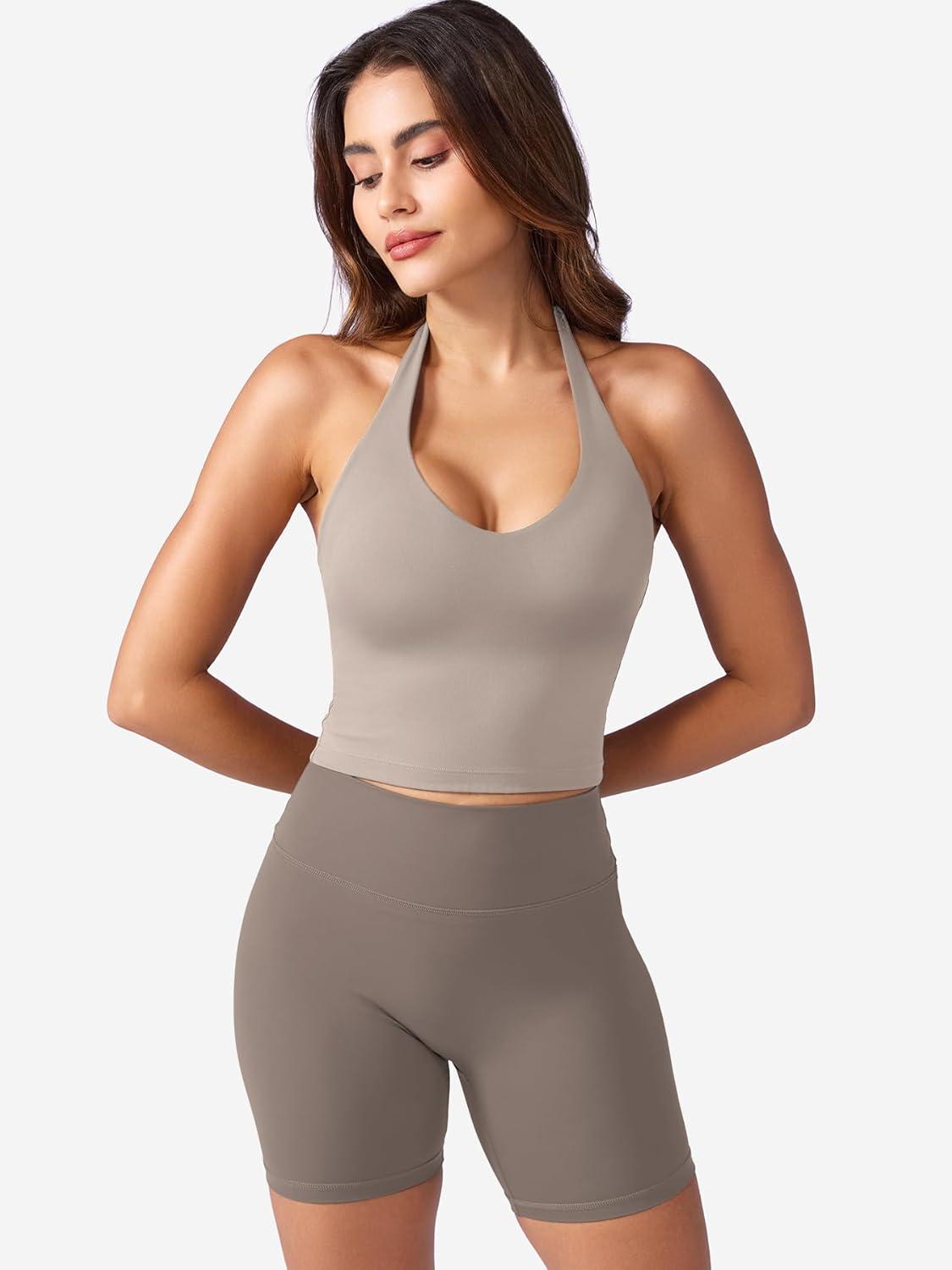 imageYEOREO Womens Halter Crop Top V Neck Workout Going Out Tank Top Hazel Padded Sleeveless Backless Trendy Summer CamisoleOat